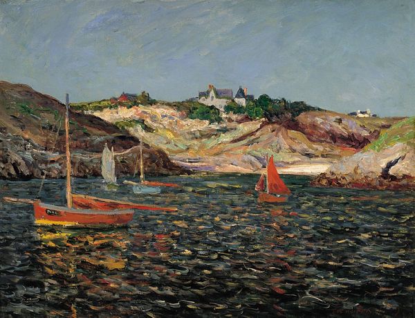 Editor: So, this is William Glackens' "New Castle, New Hampshire," painted in 1909. It's an oil painting, and I love how bright and sunny it feels. The buildings and boats seem so full of life. What's your take on this piece? Curator: It's interesting to see Glackens engaging with Impressionism. We often see him in the Ashcan School, documenting urban grit, but here, he presents a scene of leisure. How do you think this depiction of New Castle connects with the socio-economic realities of the time? Editor: That's a good question! Maybe this painting caters to a specific audience, portraying a kind of idealized vacation spot. Is that fair? Curator: Exactly! Consider the rise of seaside tourism in the early 20th century. Art increasingly played a role in promoting places like New Castle as desirable destinations. What do you observe about the composition? Is there something unusual about it? Editor: The composition is very interesting; how the road on the left is leading us into the seaside view, right? And the strong diagonal of the fence really guides the eye too. Curator: Indeed, and it's more than that. The way Glackens flattens the space, with the buildings and water almost on the same plane, shows the influence of Japonisme, which was very fashionable among Impressionist painters in Europe and America. Do you notice the impasto strokes too? Editor: Absolutely, the thick paint makes it almost three-dimensional. I wouldn't have connected it to Japonisme without you pointing it out, though. Curator: Glackens is negotiating his role as an artist. On the one hand, he presents an apparently unvarnished view of everyday life. On the other, he wants to be accepted within the established art world. He is doing this by adopting some of the stylistic elements favored at the time. Editor: It is quite thought-provoking to see how art can be simultaneously a product and a driver of social trends. Curator: Indeed. And understanding this intersection is key to grasping art's complex relationship with society and commerce.