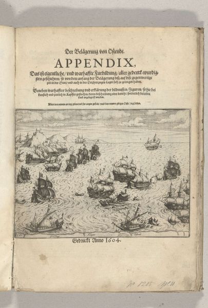 Curator: What a fascinating print! This piece, entitled "Vernietiging van Spaanse galeien, 3 oktober 1602," or "Destruction of Spanish Galleys, October 3, 1602" commemorates a historical naval battle. The piece itself dates from just after the event, sometime between 1602 and 1604, and is currently held here at the Rijksmuseum. What's your first impression of it? Editor: The whole thing reads like organized chaos, doesn't it? So many ships crammed into this little patch of sea—it makes me think of the sheer claustrophobia of naval warfare. And there's this intense feeling of confined action; it’s not an open, sweeping vista. Curator: Absolutely. And note the Baroque landscape style. It definitely enhances the drama. You know, landscapes, especially marine scenes, were increasingly popular as vehicles for narrative and historical painting during this era. So it's not just a seascape, it's history in action. Editor: What’s striking is how everything is so meticulously rendered. You can practically count the cannons. Is this focus on detail intended to glorify military precision? Curator: That's perceptive. Details matter, and their meticulous rendering here almost sanctifies Dutch naval might. The event itself—the Dutch victory—was critical in establishing their power. You can see those tiny flags as visual proof of triumph. Editor: Those flags become symbols then, right? Assertions of cultural identity and expanding power. Curator: Indeed. Notice the overall composition. The ships aren't randomly scattered; the placement creates diagonals, directing our eyes to points of engagement and emphasizing the organized nature of the Dutch fleet. There are definitely symbols loaded in. Editor: It's as though the artist is deliberately staging this maritime theater, turning a messy, violent event into a structured display of Dutch heroism. The use of print – the multiple available copies– makes it accessible for broad consumption, it helps to spread and consolidate such national heroic accounts. It is fascinating to see how the combination of chaos and a well-structured image ends up speaking of power, even in defeat. Curator: Yes! It’s about crafting and sharing a particular story for generations to come, what we today could call 'visual propaganda'. Editor: Absolutely. An enduring visual representation of Dutch maritime strength, and a fascinating piece of history, told on paper. Curator: A tiny time capsule for national pride, quite powerful, considering it’s just ink on paper!