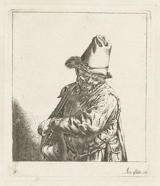 Editor: Here we have "Peasant with his hands behind his back," an etching by an anonymous artist, dating back to around 1631, housed in the Rijksmuseum. I am immediately struck by the diagonal lines creating the peasant's cloak. What is your take on this print? Curator: A compelling element lies in the linear quality of the etching. Notice the cross-hatching employed to define the form, building tone and texture. Consider how this technique directs our gaze, controlling our perception of light and shadow across the figure. Editor: It almost looks unfinished with all the sketch-like cross-hatching. How do we see that within the work? Curator: The network of lines doesn’t necessarily aim to deliver the most accurate realistic portrayal, but rather suggests form and volume. The dynamism of line, its varying thickness and density, becomes a primary subject of the work itself. What is your interpretation? Editor: So, the technique is almost as important as the subject matter. That shifts my perception. Curator: Precisely. The print challenges conventional portraiture. We move beyond likeness to engage with the pure artistry of the medium. Notice how the texture of the paper also interacts with the lines, almost blending together. Editor: Now I can appreciate the technique a bit more than the actual representation of the peasant. I had never really noticed that before. Curator: Indeed, such close scrutiny reveals new appreciation for even seemingly simple artworks.