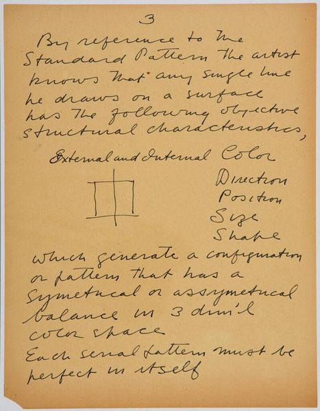 Editor: Here we have Stuart Davis’s *Art Theory Text with Sketch*. It's a drawing, although the exact media isn't specified. There's text and a diagrammatic sketch. What strikes me is the contrast between the almost scientific attempt at explaining art and the freehand sketch above. What do you make of this piece? Curator: The text and sketch offer insight into Davis's artistic process. Consider the materials: inexpensive paper, pen – readily available tools. This connects to a larger question: how did Davis see the "production" of art, the labor involved, and its relation to the everyday “metabolism” he mentions? It’s a challenge to high art notions. Editor: So, you see his theory as a way to ground art in everyday making? It's less about inspiration and more about process and material conditions? Curator: Precisely. The very act of writing and sketching, the materials used, challenge the romantic view of artistic creation. Davis seems to be exploring a materialist approach to art theory. Editor: That makes me think about the inaccessibility of his language in contrast to the apparent simplicity of the sketch. Curator: Yes, precisely! His words obscure the artistic and material gesture. A fitting end to our discussion, don’t you think?