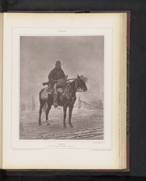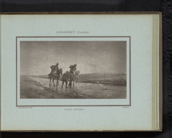 Curator: This is a reproduction of a painting by Evariste Vital Luminais, dating from before 1884, and it depicts “The Flight of Gradlon.” It’s realized through printmaking techniques: etching and engraving. Editor: What a dramatic scene. The dark figures of the riders battling the rough sea make it feel overwhelming. It has a cinematic feel about it. Curator: Yes, that’s characteristic of much narrative-driven history painting of the Romantic era. Luminais often turned to episodes from Breton history and legend. Gradlon, here, was a legendary king of Brittany. Editor: So, what historical or political sentiments might the original painting express, especially within the context of its time? This seems like a potent metaphor for struggle and resistance. Curator: Undoubtedly, it resonates with themes of cultural identity and regional pride. We must remember that 19th-century France was a cauldron of regional, cultural, and political debates, particularly around defining French identity and power. These Romantic depictions offered heroic, sometimes tragic, narratives that explored Brittany's distinctive past, potentially resisting homogenization within a centralized French state. Editor: And that fleeing across turbulent waters reinforces a feeling of a last desperate escape. Who are the figures? It is clear that one of the figures is clutching someone or something. Curator: According to the legend, Gradlon is fleeing a flood. The figure he clutches is often said to be his daughter, or sometimes other figures central to Breton legends, depending on the version. Editor: This work speaks powerfully about resilience, the desperation of preserving a culture or lineage in the face of disaster. Considering that the legend is connected with natural catastrophes like floods, in our era the work could evoke feelings about ecological collapse. It speaks of the difficulty to save what is precious during environmental upheaval. Curator: Absolutely, and art like this also illuminates the ongoing use of historical narratives to engage with contemporary concerns. By understanding the historical roots of images like these, we gain a richer perspective on how collective identities are constructed and challenged across generations. Editor: It makes you think about which stories we continue to tell and what purposes they serve now. This piece becomes more resonant when thinking about how historical pieces connect to modern experiences.