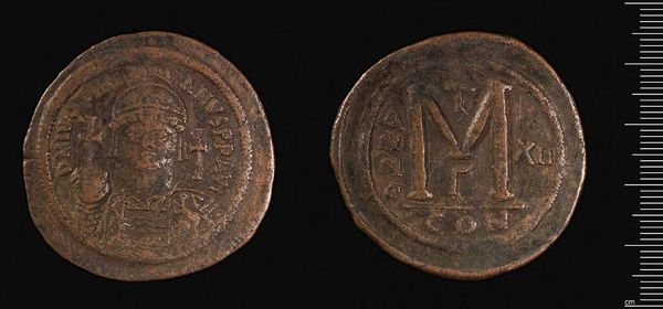 Editor: Here we see a coin of Justinian I. The raised relief and textures are still so clear. What do you see in this piece, looking closely at the form? Curator: The die-striking is quite masterful; notice the strong lines defining Justinian's figure, juxtaposed with the symbolic "M" on the reverse. How do these elements work together? Editor: The "M" is so bold; it almost overpowers the emperor's portrait. Is that a commentary on power, or simply a design choice? Curator: Consider the medium: a coin is inherently about value. The size and placement of the "M" perhaps emphasize economic strength as integral to Justinian’s reign. We might also consider the cross. Editor: That’s a new way for me to consider it. I appreciate noticing how the different elements of the design contribute to the meaning.