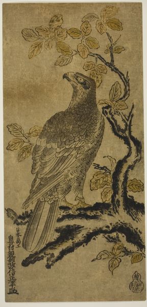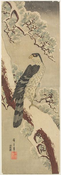 Utagawa Hiroshige created this ‘Falcon’ kakemono-e, or hanging scroll print, using woodblock printing techniques. The composition is dominated by the verticality of the tree trunk, which anchors the dynamic pose of the falcon perched upon its branch. The textured plumage of the falcon, rendered in nuanced greys and blacks, contrasts with the soft, muted palette of the background and the reddish-browns of the tree. Hiroshige masterfully employs asymmetry to create a sense of naturalness and movement. The falcon’s gaze directs us upwards, engaging with the implied space beyond the frame, destabilizing a purely formal reading of the piece. The moon at the top right, lends a poetic, contemplative quality to the scene. It invites us to consider the symbolism inherent in Japanese art where animals and natural elements carry layered meanings. The falcon, a symbol of strength, power, and keen vision, is balanced by the moon, representing tranquility and reflection. Together, they illustrate the inter-play between action and contemplation.