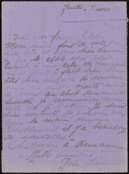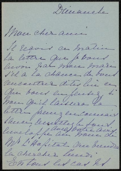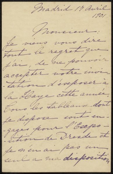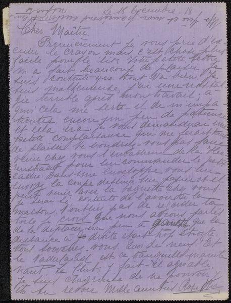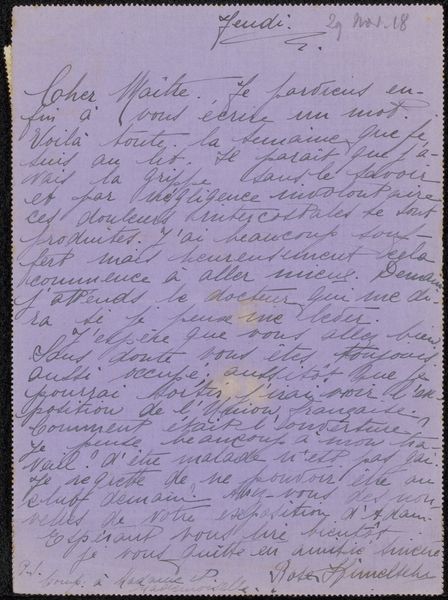 Curator: Here we have "Brief aan Philip Zilcken," or "Letter to Philip Zilcken," a drawing possibly from 1918 by Rose Imel. It appears to be ink on paper, showcasing Imel’s distinctive hand-lettering. Editor: The entire page feels incredibly intimate, doesn't it? Like a personal diary entry, not meant for anyone's eyes but our own through a strange twist of fate. Curator: Absolutely. Letters have that power, freezing a moment in time. Imel’s choice of inscription is especially interesting given that the piece is rendered with such a personalized aesthetic. It makes the page look quite spontaneous. The use of freehand drawing and the soft purple of the surface contribute to a feeling of something fragile. Editor: Definitely. And situating it within its time, 1918, it makes one consider what this individual may have lived through, with war as a backdrop for their daily life. Does the content give hints of any war anxiety, or can you perceive this through Imel's state of mind during this period? Curator: While it is hard to deduce an absolute reading of the state of mind, what is fascinating is how Imel imbues the visual form of the text with almost a sense of… character. It goes beyond mere functionality; the hand-lettering here really feels like an emblem of expression. Editor: Yes, a sense of directness from the author to the recipient. It is as if the visual style makes it even more specific, like their relationship already exists. Perhaps, what Rose Imel expresses to us is also how female friendship allowed strength to bloom amid the difficulties they experienced during the period of World War One. It feels radically hopeful and resistant. Curator: That sense of defiant optimism certainly resonates through the piece. Imel seems to take the inscription almost as a performative act of creating intimacy within the public context of art. It reminds us how artists often weave hidden languages of sentiment into their works. Editor: So much is contained in those deliberate choices—revealing how private lives always unfold alongside major historical events. Looking at Imel’s letter, it prompts me to think more deeply about these interconnected histories and memories, public and private. Curator: Agreed. Art invites us into conversations—sometimes across vast stretches of time—sparking dialogues between the visible and the unspoken.