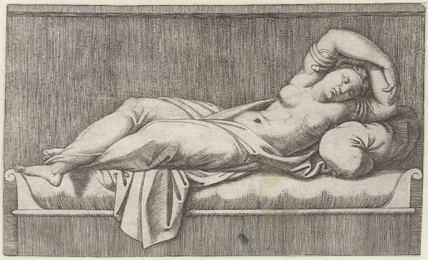 Curator: Let's explore this engraving titled "Venus liggend op bed," created by Johan Danckerts in 1657. Editor: My first impression is its somber tone despite the subject matter. The hatching creates such deep shadows; it feels almost melancholic rather than sensual. Curator: Precisely! While overtly depicting Venus, the goddess of love, consider the era. The Dutch Golden Age saw a burgeoning interest in classical themes interwoven with moral undertones. Nudity, a staple of classical art, here navigates between aesthetic beauty and perhaps, a commentary on earthly pleasures. Editor: The composition is quite striking. Notice the use of the image within the image – a depiction of what looks like a maid tending to a bed. It almost frames the figure of Venus, segmenting the artwork, adding a temporal dimension. Is it before or after a momentous occasion? Curator: A sharp observation! I see echoes of familiar symbols. The discarded garment hints at vulnerability, but also the transience of beauty. The jewelry—the bracelets—might also reference societal constraints, subtly questioning freedom, even for a goddess. And the use of the window seems quite deliberate... Editor: Absolutely. It serves as both a structural component, separating the domestic from a seemingly exterior world, but also to bring a contrasting light and perspective onto Venus's chamber. The use of chiaroscuro brings out texture, gives form and substance to what seems like it wants to retreat in a heavy baroque drape and shadowed chambers. Curator: Indeed, it is that play with darkness that adds depth, both literally and symbolically. Danckerts uses line not just to delineate form, but to evoke a mood—a kind of pensive reflectiveness. Perhaps this artwork is not just a depiction of Venus but an invitation to consider the complexities of desire and the weight of expectations, gender and beauty? Editor: Agreed. On closer inspection of Danckerts handling of texture via hatching and line work we find something else to contend with: temporality. The details feel captured, specific, and like so many historical drawings, a bit lost to time as well, a perfect reflection on the subject of venus as captured for a moment. Curator: This deep dive, considering symbols and structure really enriches our understanding. Thanks to this detailed reading we could truly appreciate the subtleties encoded into its graphic structure! Editor: Indeed. The more we study the formal qualities, the more we start to unlock meaning.
