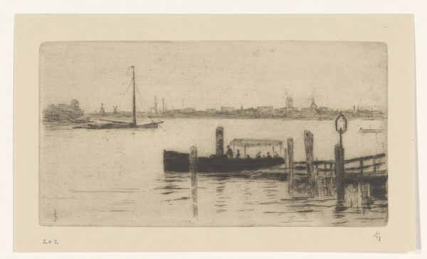 Curator: Let’s turn our attention to Willem Witsen’s etching, “Gezicht op de Leuvehaven in Rotterdam,” likely created between 1897 and 1906. Editor: Wow, there’s something so quiet and almost… blurry about this. It feels like looking at Rotterdam through a rainy window, you know? That soft gray light, and those sturdy boats. It’s simple but really draws you in. Curator: It does, doesn’t it? Witsen, steeped in the tradition of Dutch realism, offers us not just a depiction of a cityscape, but a meditation on it. What’s fascinating to consider is the relationship between the built environment, represented here with aged paper, and the individual figure, which, by extension, implicates the impact on the socio-political contexts of the moment. Editor: Right. You see that little rowboat, with a person in it? They seem so tiny compared to everything else. And all those details kind of blur into this hazy impression, especially if we relate it to other Witsen's artwork produced around the same period. The person sort of becomes part of this watery world. Curator: Exactly. By employing the etching technique, he gives form to that world while at the same time subtly underlining the tensions between industrial expansion and the preservation of social space. This work speaks, perhaps implicitly, to a larger historical moment wherein port cities undergo significant change that invariably alters community relationships. Editor: Okay, so what you're saying is, beyond just being a pretty picture, Witsen might be hinting at a struggle between progress and tradition? And also pointing towards the possible marginalization of a specific portion of society? Curator: Precisely! And consider, too, that in order to experience that struggle, you might also ask to what extent might social structures have impacted access to that waterfront or access to those waterways. It raises important questions around class and public space at that particular moment. Editor: All that from a blurry boat and a gray day! I love how something that seems so simple can hold so much depth if you look closer. The etching is gorgeous by itself, but adding that social element just changes how you perceive the artwork entirely. Curator: It reminds us of art’s power not merely to reflect but also to instigate vital discourse. Editor: Agreed. I’m not sure I'll see any cityscape quite the same way now.