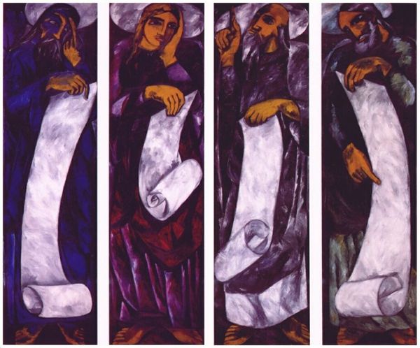 Editor: So, this mural, "Call to Revolution and Table of Universal Brotherhood," was painted in 1931 by José Clemente Orozco, using the fresco technique. At first glance, it feels… solemn, almost like a prelude to something momentous. What do you see in this piece? Curator: Immediately, I'm drawn to the hands. Notice the gesture of giving, the hand outstretched. It echoes centuries of symbolic imagery – think of religious paintings where such gestures represent divine grace or the passing of knowledge. But here, it’s a worker, offering something earthly – tools, sustenance, or perhaps solidarity. What is he passing on, and why? Editor: Maybe the bread on the table symbolizes a more communal sharing of resources? Curator: Precisely. Food is a recurring motif, linking back to ideas of shared labour and social justice. The table itself acts as a modern-day altar. In Western painting tradition the table could represent abundance or ritual but here, juxtaposed against the figures seemingly on the precipice of revolution, I think it asks us where, and to whom, that abundance is allocated, doesn't it? Editor: That's thought-provoking. It's almost as if the figures and objects aren't just representing themselves but embodying larger historical or political forces. Curator: Exactly! Orozco pulls from our collective memory of religious art, reshaping those familiar symbols into revolutionary statements. He asks, how can we forge a new collective memory centered on labor and shared humanity? Editor: I see how this reading transforms my initial sense of solemnity into something much more…active. It's not just a prelude, it's a call to action! Curator: Indeed! Orozco uses powerful, pre-existing imagery to speak to our deepest psychological needs and create potent new narratives. Hopefully, this brief time with the work has given you something to reflect on. Editor: Definitely. I’ll never look at a table in a painting the same way again. Thanks!