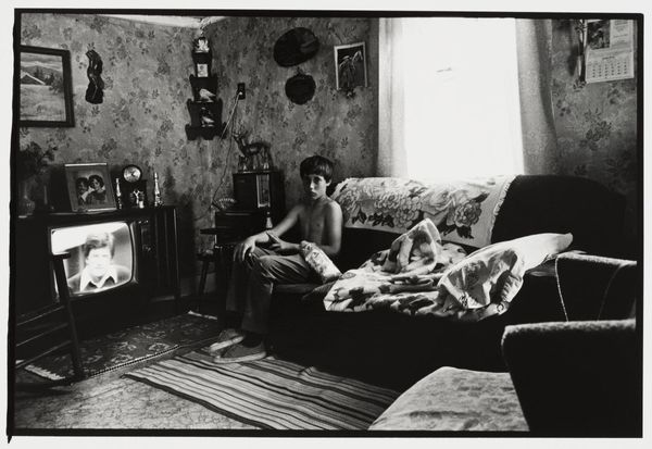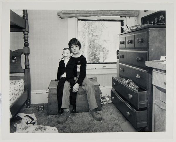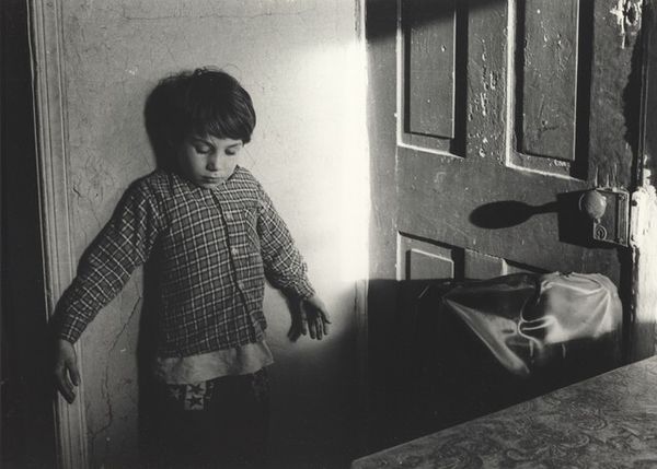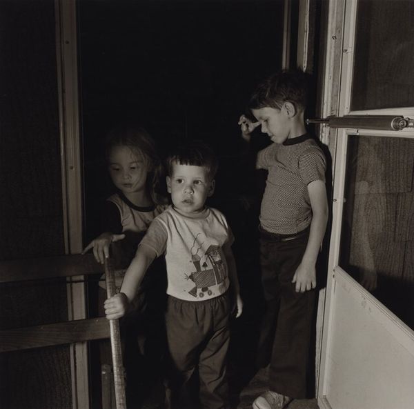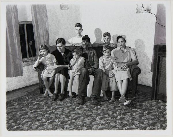 Curator: Larry Fink's photograph, "Eleventh Birthday Party at the Sabatine’s, Martins Creek, Pa.," presents us with a compelling, though somewhat unsettling, scene. Editor: The texture of the print and the gray scale seem to amplify the unease; the composition, with the subjects pressed together, creates a sense of claustrophobia. Curator: Fink's deliberate use of flash flattens the space and highlights the subjects’ expressions. Observe how the composition is structured around horizontals and verticals, lending a classical balance to the supposedly spontaneous moment. Editor: Yet that "spontaneous moment" feels meticulously constructed. The visible labor of the photo—the staging, the flash—becomes a character in itself, revealing class dynamics and the performativity of social gatherings. Curator: There's a certain rawness, an almost uncomfortable intimacy, achieved through the stark contrasts and the unflinching gaze. The geometry is very intentional. Editor: Agreed, but it is important to consider how Fink’s presence, his very act of photographing, alters and perhaps even exploits the reality of this working-class gathering. The materiality of the final print complicates the straightforward reading of the image. Curator: Indeed, it's a photograph that invites contemplation of form and feeling. Editor: For me, it is less about form, and more about the forces and conditions that made this image possible.