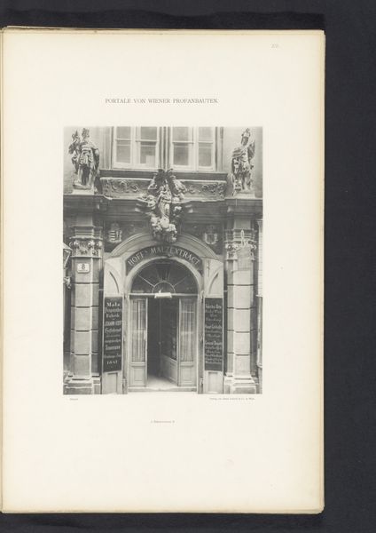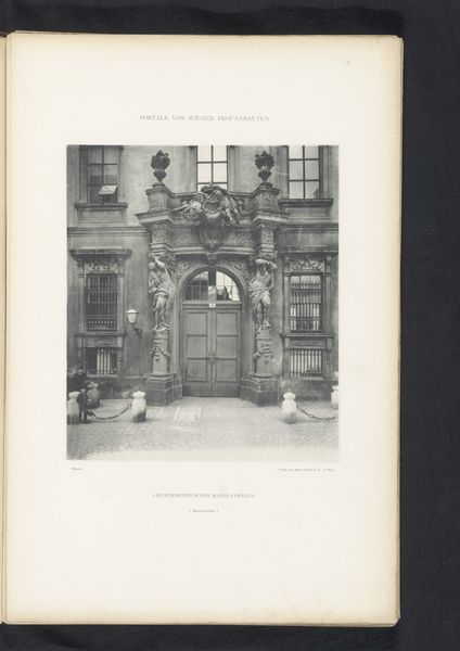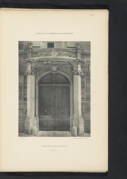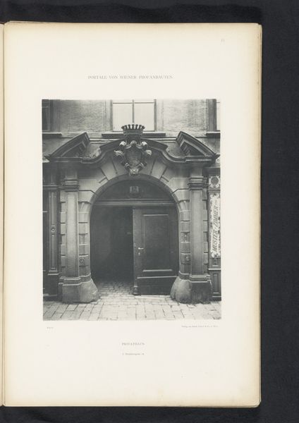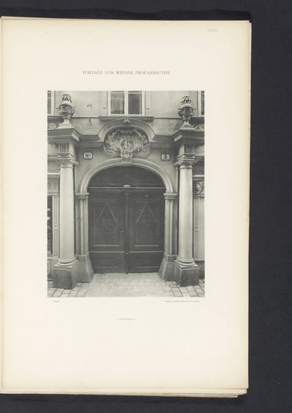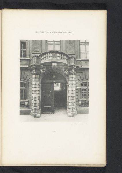 Curator: At first glance, it has a really solemn feel; so balanced and grand but somewhat forlorn. Editor: Precisely. Let's delve into this. We're looking at a photographic print titled "Toegangsportaal van het Michaelerhaus te Wenen," placing it in Vienna before 1894. The image, rendered in black and white, captures the entrance portal of the Michaelerhaus, and knowing photography had become rather ubiquitous, its role in shaping our understanding and memory of architecture really begins to evolve around this time. Curator: I notice that it really captures how civic and domestic spheres were divided, right at this moment when early modern social systems were also being renegotiated. What construction materials were utilized? What labor went into creating these massive thresholds, defining private vs public space? Editor: Absolutely, consider the historical context. Vienna was, at the time, the capital of the Austro-Hungarian Empire. The Michaelerhaus would have been constructed as a grand residence, its architectural details like these projecting cornices and capitals designed to convey the wealth and power of its inhabitants. These weren’t just thresholds, they were carefully constructed symbols, aren't they? How do those architectural elements, the stones, become messages in themselves? Curator: It also reveals an increasing cultural access and desire for replication. Photography makes these elite aesthetics much more visible—creating new material desires. Think of all the hands involved, from quarry to engraver, mason to binder – it wasn't a simple task! What about its place in the market of images, though? Editor: I'd argue this photograph played a key role in visualizing Vienna as a center of power and cultural sophistication for audiences far beyond the city, disseminating architectural styles and aspirations. The mass reproduction aspect is pivotal, enabling it to circulate through different social classes and construct a shared identity, or aspiration, centered on Vienna’s grandeur. Curator: True, but the print also stands as a marker of technological evolution—changing processes and broader markets were all impacting what artists and makers could achieve, even back then. Editor: I see it less as a departure and more as a clever adaption, of architecture broadcast through mass culture. The doorway represents not only a threshold between spaces, but a bridge across time and cultural understandings. Curator: Indeed. It’s about understanding architecture—both physical and photographic—as cultural output, driven by the availability of tools and the mechanics of reproduction.