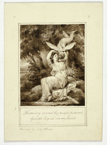 Editor: So, this is "L'Amour en Sentinelle" – "Love on Guard" – an engraving by Simon Charles Miger, dating from around 1745-1806. The cherubic figure and overgrown garden have this whimsical feel...it almost feels like a dream. What do you see in this piece? Curator: This piece vibrates with coded gestures from its time. Cupid himself is front and center, piping a tune on what looks like a recorder, which makes you wonder: is it a call to action, or something else entirely? Note the two doves flying above. How do they influence your impression? Editor: I see them as symbols of peace and love, reinforcing the cherub's role as a...well, Cupid! Is there more to the bird symbolism than that? Curator: It's important to remember that doves often appear as psychopomps. And recall Cupid's discarded bow, relegated to the lower right quadrant, nearly concealed by foliage. In this garden tableau, the god of desire seems to advocate a subtler, more lyrical, approach. Do you get a sense that it's love requited or unrequited? Editor: Now that you mention it, there’s a sense of...longing, maybe? Something slightly melancholic in his stance, the instrument he’s playing and how alone he appears in that setting. It is complicated, not simply about being in love! Curator: Precisely. This complexity— the interplay of Eros and vulnerability— resonates across time, which means, cultural memory is actively being transmitted. We feel it; we learn from it. Editor: I hadn’t considered how those familiar symbols could convey so much more. Thanks for opening my eyes! Curator: The pleasure was mine. Recognizing symbols as keys that unlock layers of cultural understanding enriches any artistic experience.