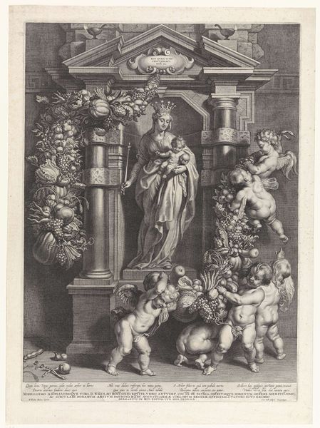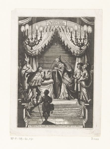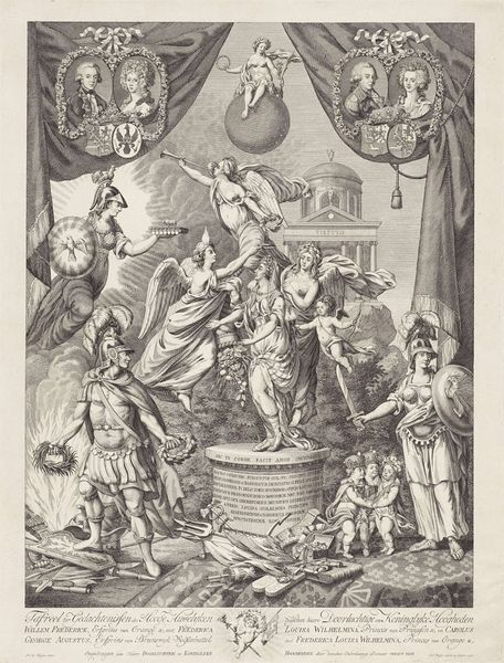 This allegorical depiction of Louis XV, dating from the 18th century, was created by Antoine Jean Duclos using etching and engraving. Immediately, the intricate lines and the monochromatic palette draw us into a world of symbolic gestures and classical motifs. At the centre, the bust of Louis XV is being crowned, flanked by allegorical figures amidst a backdrop of books and scholarly paraphernalia. The composition, built on a pyramid-like structure, directs our gaze upwards to the crowning moment, and then down to the playful cherubs symbolizing the arts and sciences. The artist uses the visual language of neoclassicism to construct a narrative of enlightenment and royal virtue. It is a cultural artifact, reflecting the aspirations and self-image of a society steeped in the ideals of reason and order. We are invited to consider how power is constructed through representation, and how visual forms can shape collective memory.