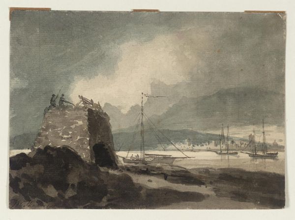 Curator: This drawing, housed at the Rijksmuseum, is titled "Figuren op een pad langs een rotskust," or "Figures on a Path Along a Rocky Coast," created by Petrus Johannes Schotel sometime between 1841 and 1865. Schotel employed pencil, charcoal, and watercolor in its making. Editor: My first impression is of quiet resilience. The misty, muted tones evoke a kind of subdued determination as figures move along this daunting precipice. Curator: Indeed. There’s a delicate balance between the vulnerability of the tiny figures and the imposing mass of the landscape. Consider the Romantic era's emphasis on the sublimity of nature—nature's ability to inspire awe, even fear. That sheer cliff face looming behind the path amplifies this effect. Editor: I agree, and I wonder about the implications of placing people—presumably ordinary people—within that sublime context. It speaks to humanity’s relationship with its environment, especially if these walkers were marginalized in some way. Are they seeking refuge, perhaps? Or forging a new path against seemingly insurmountable odds? Curator: It’s certainly open to interpretation. But observe how Schotel utilizes very faint lines of pencil sketch underneath and charcoal drawing. He almost erases the human presence with the subtlety of the rendering, suggesting their lives might be but a transient blip in geological time, dwarfed by something with greater importance. Editor: That might actually speak more to the class structures of the period, though. Was the artist thinking about which lives, which stories, get centered or disappear? Consider how gendered assumptions or racist presumptions of who is even capable of claiming ownership of space might make certain people seem faded in historical records. The mist may well erase the memory of some stories and emphasize the prominence of others. Curator: Perhaps. Art has power over time and, therefore, memory. Though whether such sociopolitical commentaries were the primary objective of Schotel in his artistry remains speculative, the visual language gives power to his Romantic landscape as well. The figures can certainly symbolize resistance against the overpowering dimensions of time and landscape. Editor: Precisely, the piece encourages us to question who and what we memorialize and to recognize the strength required to traverse paths made precarious by systemic injustice. It is beautiful because of how open the artist was able to allow an inclusive understanding, with more questions than answers for each viewer, regarding an awareness for that memory over time.