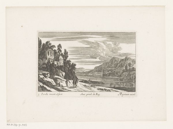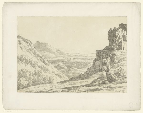 Curator: Reinhart’s “Antieke graftombe aan de Via Nomentana,” created in 1792, presents us with an intriguing scene. Crafted with etching and engraving on paper, this print exemplifies a landscape rendered in a distinctive Romantic style. Editor: My first impression is one of quiet melancholy. The decaying tomb juxtaposed against the serene landscape evokes a sense of time’s relentless passage. Curator: Indeed. Note how Reinhart employs line work to create a sense of depth and texture. The crumbling architecture is meticulously rendered, emphasizing its geometric form even in decay. It offers a stark contrast to the organic, flowing lines of the surrounding hills and vegetation. Editor: Absolutely. The tomb itself, despite its ruinous state, is a potent symbol of past glory, isn't it? Think of what it might have represented: permanence, remembrance, perhaps even a defiance of death. Now it's slowly being reclaimed by nature. It reflects on themes of mortality and transience, echoed in the solitary figure playing his flute amidst the ruins. Curator: I see your point. Observe how the play of light and shadow across the structure creates further visual interest, drawing the eye to specific details and reinforcing its monumental presence. The atmospheric perspective achieved through careful engraving gives the piece a unique spatial coherence. Editor: It’s also fascinating how he includes the figures. The presence of shepherds and their flock grazing near the tomb underscores the ongoing cycle of life in contrast to the silent, stony remains of the past. This highlights a subtle commentary on the layers of history coexisting within a landscape. Curator: From a purely formal perspective, I admire how Reinhart balances the composition. The tomb, while dominant, is anchored by the surrounding landscape, creating a harmonious interplay between man-made structure and the natural world. Editor: Agreed. As a meditation on time, memory, and the cyclical nature of existence, this etching offers both aesthetic pleasure and symbolic richness. Curator: A fitting piece, then, to end on the balance and decay. Editor: Indeed, a quiet yet profound observation of time’s artistry.