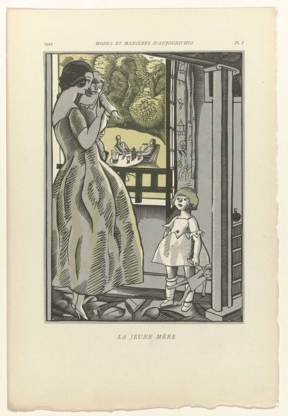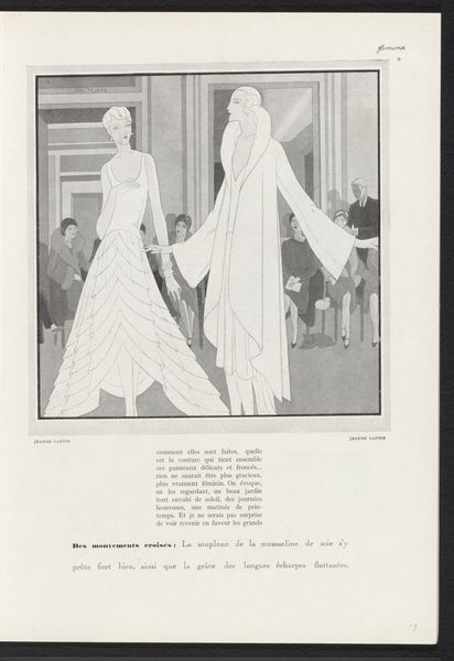 Curator: Welcome. Today, we're looking at an ink drawing from 1928 entitled “Femina, Mars 1928: 4: Les capes de jour et les capes du soir.” It showcases a fashion advertisement or editorial. Editor: My first thought is: how stark, yet stylish. There’s a striking graphic quality, achieved through strong black and white contrasts, with all of its subtle textures created with delicate line work. It's of its time but also strikingly contemporary. Curator: Indeed. Ink, a readily available material, made reproduction easier for mass distribution in magazines like *Femina*, reaching a wider audience. Note the craftsmanship. How does this type of illustration work, as a medium for broader, industrialized garment manufacture, impact ideas around craft and consumption at the time? Editor: These images reflect ideals about the role of women in society—elegance, leisure, and fashion being central. The women are slender, almost androgynous. There’s an ambiguous and detached feel about them, they almost appear like mannequins on display. Consider how fashion defined and confined women, reflecting shifting, but still limiting gender norms. Curator: And what about the emphasis on line and form, which suggests Art Deco's influence in design, production methods, and industrial arts? How would such drawings allow garments to be marketed and subsequently manufactured? Editor: Precisely. The image normalizes a certain type of aspirational lifestyle that could become increasingly accessible with mass production. This drawing doesn’t only display the clothes, but a social class and a particular aesthetic tied up in privilege and power. Curator: Thinking about material conditions, the paper stock would allow for relatively cheap and rapid dissemination to influence trends and the clothing industry itself. Editor: That’s a critical consideration, too. Analyzing this image is not just looking at the artistry, it’s seeing it as part of larger social and economic patterns affecting women and their roles in society. Curator: Absolutely. When examining the artwork it becomes a valuable window onto the production, distribution, and consumption of both art and fashion. Editor: I think the drawing urges us to consider the gaze—how fashion images affect how we see ourselves and others in society.