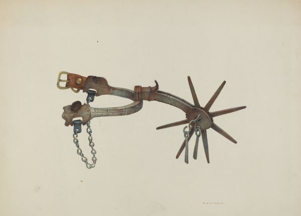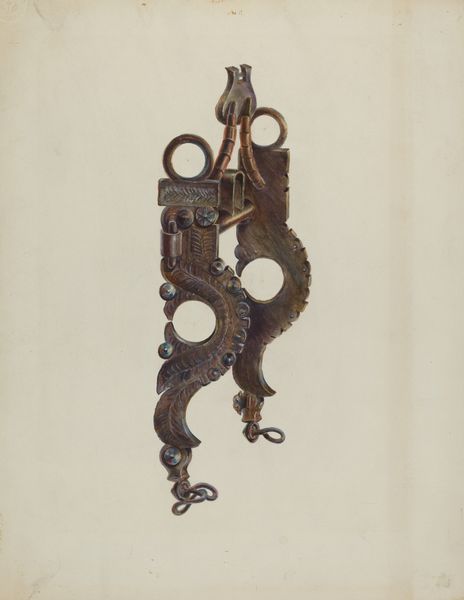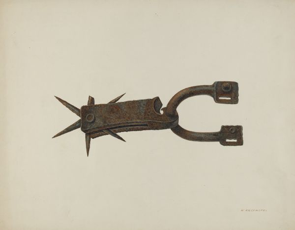 Gerald Transpota’s watercolor work, Wrought Iron Bit, presents us with a detailed study of an object deeply entwined with human and animal labor. Born in 1855, Transpota lived through a period of immense industrial and social change, including shifts in labor practices and the evolving role of animals in agriculture and transport. This image of a horse bit invites reflection on the relationship between humans and animals. Historically, such tools symbolize control and the harnessing of animal strength for human endeavors. We might consider the cultural implications of this relationship, thinking about power dynamics, ethical responsibilities, and the emotional aspects of working alongside animals. Transpota's careful rendering encourages us to consider the individual craftsmanship involved in creating such an object, in contrast to the mass-produced items of the burgeoning industrial age. This artwork asks us to consider the value and meaning we ascribe to both labor and the tools that define it.