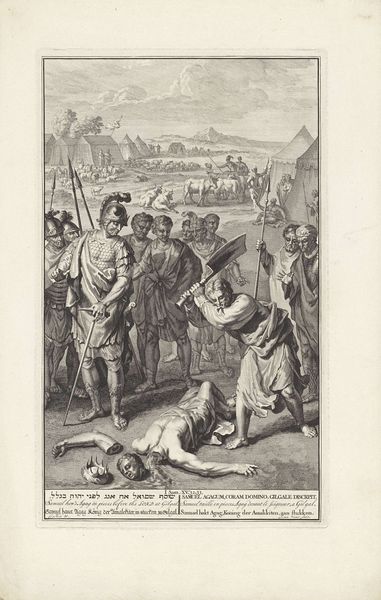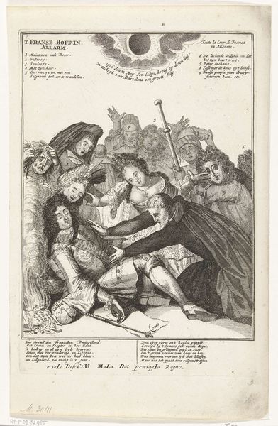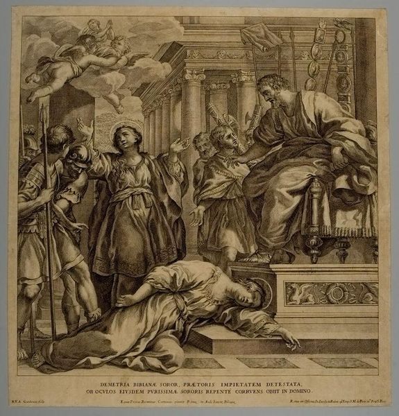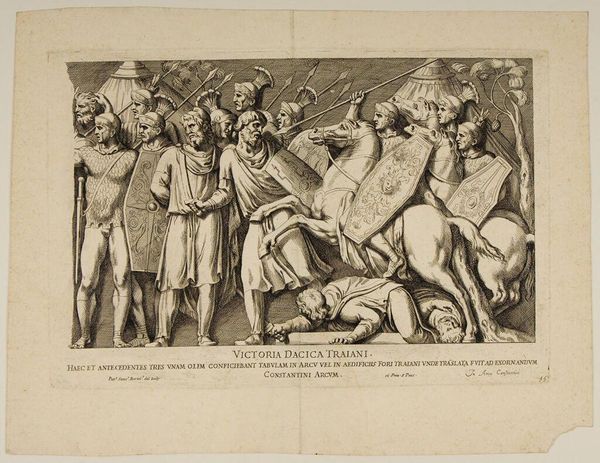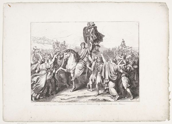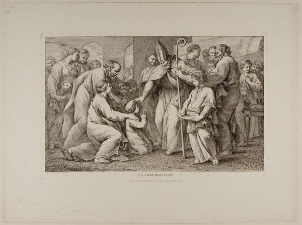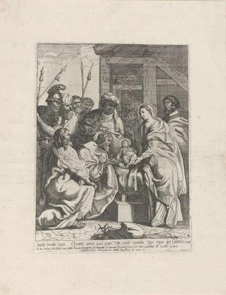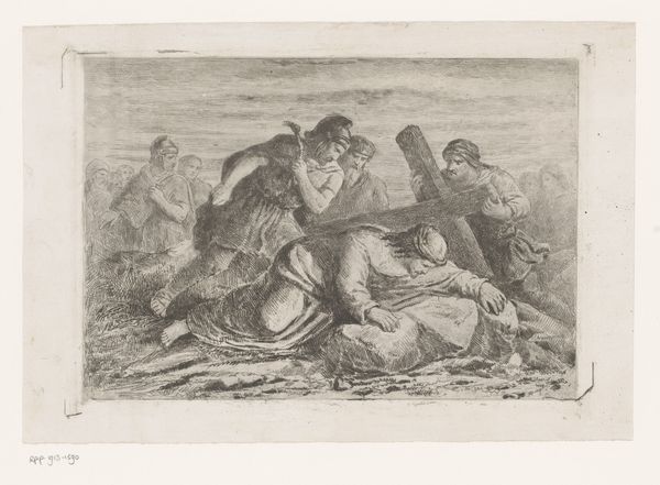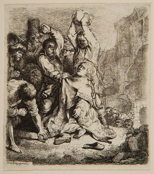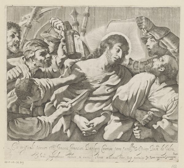 Curator: Let's discuss Giovanni Battista Pasqualini's print, "Christ Taken in the Garden." Editor: What strikes me is the absolute tension in the etching—a very claustrophobic scene, yet Christ seems almost detached. Curator: Pasqualini, active in the early 17th century, was very interested in the material translation of artistic ideas, evidenced in his work for printmakers. Here, his skill is evident in the detailed rendering of textures. Editor: Those robes, for example. You can almost feel the coarseness of the fabric, juxtaposed against the smooth, almost ethereal quality of Christ's halo. Did he use different techniques for different effects, perhaps different needles or acids? Curator: Precisely! The etching process itself becomes part of the narrative, doesn't it? Each line, each mark, a tiny act of labor contributing to this moment of betrayal. And from that labor, emerges this striking contrast of violence and peace. Editor: The physicality of the scene, the labor of its making... it all adds weight to the story. I see process; I see the hand, and I imagine that hand struggling to bring this moment to life.