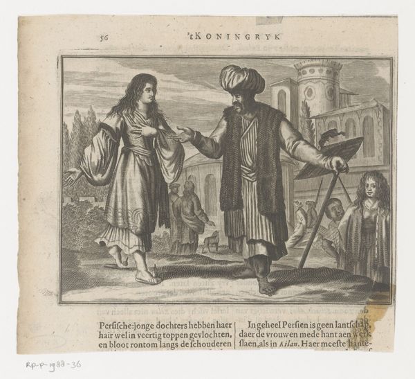 Curator: Looking at this engraving titled “Perzische klederdracht,” or "Persian Costume" from 1672, I'm immediately struck by the way it tries to capture something distant and exotic. What do you make of its overall feel? Editor: There's a dreaminess to it, wouldn’t you agree? I mean, these figures seem plucked from a tale, the rendering feels deliberately quaint, despite its obvious aim for factual representation. And all those spears poking up in the background - hints of narratives untold... almost surreal. Curator: It's true, the scene possesses a romantic quality, one very much in line with the Baroque fascination for the “Orient,” a blend of scholarly observation and pure projection. See how meticulously they render the turbans, robes, and even the woman’s headwear? Editor: Absolutely. Details upon details - a sort of obsessive dedication… What’s more compelling is how that intensity exists alongside that almost whimsical backdrop; ruins fading, a boy nonchalantly watching… a captivating push and pull between perceived realism and poetic whimsy. What does it tell us about Dutch impressions of Persia back then? Curator: I think it speaks to a fascination, filtered through both trade relationships and a desire to catalogue the world. Engravings like this weren't necessarily about deep understanding, but about visual consumption – a way for Europeans to "possess" knowledge of distant cultures, from Islamic art’s fashion to societal norms, without ever setting foot there. Editor: Ah, that brings another, admittedly conflicting thought to mind: these aren't neutral portraits. These depictions inevitably served certain sociopolitical agendas too, coloring foreignness in a way that bolstered a particular world view. It makes you ponder: what's omitted from these visual reports, in favour of a "richer" storyline? Curator: Precisely! And perhaps the point isn't whether it's "accurate" by our standards, but what stories it told, what desires it reflected, and what role it played in shaping early understandings of a part of the world very different from their own. Editor: Agreed. That consideration makes "Perzische klederdracht" infinitely more intriguing. Thanks for shining that light.
