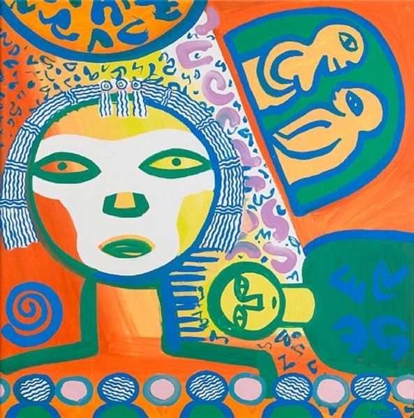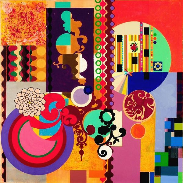 Eileen Agar painted "Lewis Carroll with Alice" with oil on canvas. The way Agar approached the surface really interests me; it is a mosaic of geometric planes and patterned textures. Each colour seems to vibrate against its neighbour. The painting is built up of flat shapes, but it still feels spatial, like a stage setting for a play. Take a look at Alice’s face, split into turquoise and yellow sections, it's a masterclass in abstract portraiture. The ears are like jokey afterthoughts, daubed with colourful blobs. In fact the whole thing feels light and playful, there is a sense of humour. Agar’s approach reminds me of Francis Picabia, particularly his use of flat colour and collage. Ultimately, Agar’s painting reminds us that art is not about perfect representation but about opening up new possibilities for seeing and feeling.