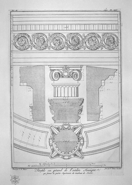 Curator: Look at this compelling print: “Demonstration in large parts of the first order interior of the Pantheon.” Etched by Giovanni Battista Piranesi. Editor: My first impression is how much it looks like an architectural blueprint. Stark monochrome lines showing elevations, dimensions. The rigid precision feels almost clinical. Curator: Piranesi had an amazing ability to translate the weight and majesty of ancient Rome into two dimensions. These weren't simply illustrations; they served a greater purpose for cultural preservation. Editor: I can see that in the meticulous detail dedicated to each volute, column flute, and cornice profile. The crisp delineation emphasises the rational geometry inherent to neoclassical design. He’s reducing monumentality to math. Curator: The Pantheon wasn’t only a feat of engineering but a spiritual hub. The oculus was an ‘eye’ open to the cosmos. Piranesi's intense precision might be trying to capture that feeling through reasoned depiction. Editor: Fascinating. So the cold rendering style is actually charged with this subtle symbolic intention. The geometry itself echoes the cosmological beliefs. Curator: It speaks to a desire to revive not only the look, but also the perceived wisdom of ancient civilizations. And he’s influencing later interpretations and recreations by creating something replicable. Editor: I see. Almost turning memory into data to guarantee future revivals of similar monumentality. A compelling record, wouldn’t you say? Curator: Definitely! It opens doors to endless interpretive possibilities—a single image holding volumes. Editor: Indeed. A simple facade revealing structural intricacies. Fascinating how clarity serves as the vehicle for memory and legacy.