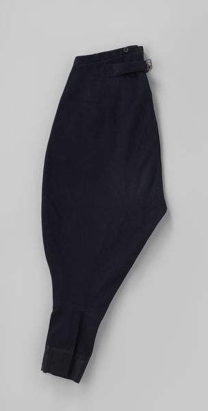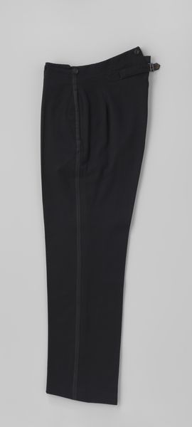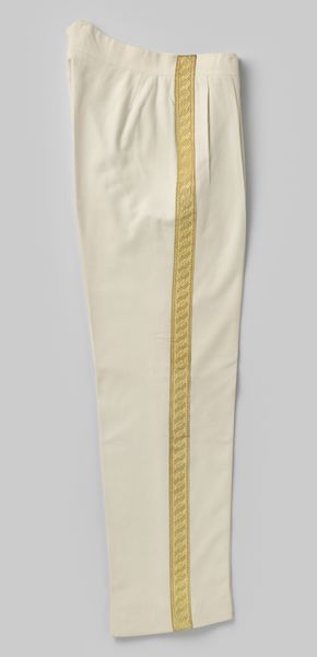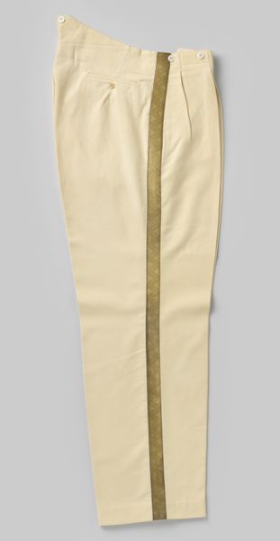 These are a pair of trousers that belonged to Mr. Ch. J. M.A. van Rooy, governor of Limburg, made by an anonymous creator. Consider these trousers as more than mere clothing. They speak to the identity and status of their owner, a governor in a specific time and place. These trousers would have been part of a formal or ceremonial outfit, indicative of his high social standing. The gold ornamental stripe suggests the opulence and formality associated with positions of power. In a world where clothing often signifies one's role and identity within the social hierarchy, these trousers would have marked Mr. van Rooy as a figure of authority. These garments invite us to reflect on how clothing can perform identity, communicating power, status, and belonging within particular social and historical contexts.