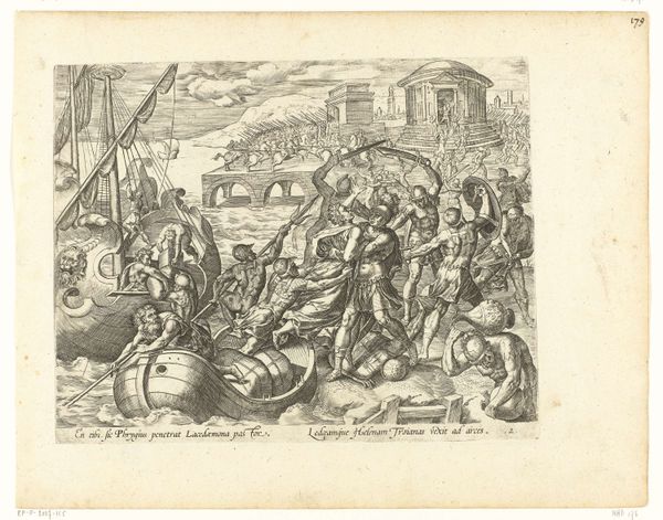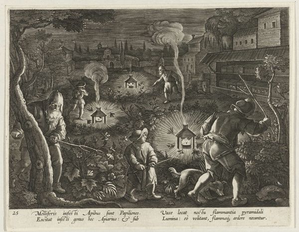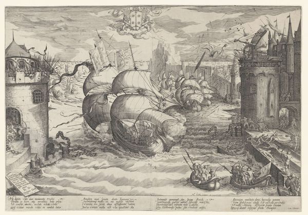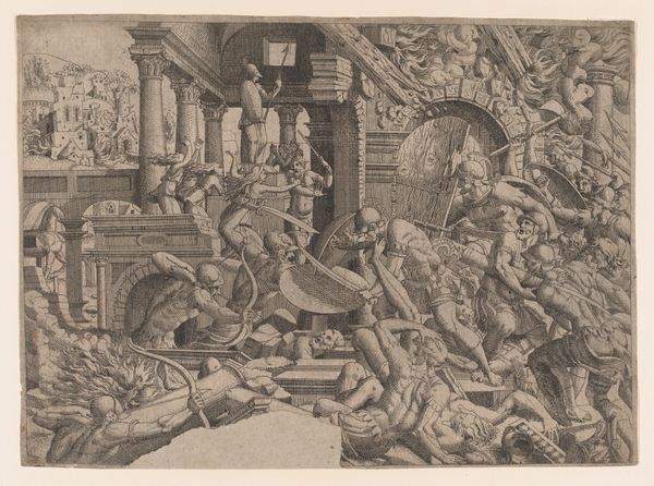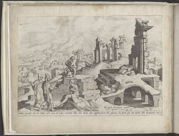 Editor: So, this is "Noah's Sacrifice," an engraving by Philips Galle from 1569. The textures and the stark contrast are really striking, and I find the image to be both hopeful and desolate. What strikes you when you look at it? Curator: Immediately, the formal composition. Observe how Galle has structured the landscape. The foreground depicts a scene of destruction and offering. Mid-ground shows the city rising once again from the destruction. Galle draws our attention, above all, to the interplay of line and texture; consider the ruins juxtaposed against the crisp details of the figures. Do you see how the use of contrasting textures reinforces a sense of renewal and desolation? Editor: Yes, definitely! The smooth lines of Noah and his family really stand out from the rough texture of the burning offering and crumbled buildings. It almost feels like two separate worlds colliding in the same space. How does that play into the overall meaning? Curator: That perceived collision is pivotal. It signifies more than a simple return to normalcy. Focus on the relationship between the architecture of devastation and the hopeful column under construction in the background. It’s not only an architectural structure, but also a metaphor for a new civilization constructed on the remnants of the old world. Editor: That’s a really insightful way to look at it! I was so caught up in the figures that I missed some of those more subtle structural and textural details that tell that story of transition. Curator: The visual language underscores a shift in the world, and this symbolic reconstruction forms the bedrock for interpretations, doesn't it? Editor: Absolutely! I learned that focusing on the structural elements can unlock so much meaning beyond the immediate narrative. Thank you for pointing out such important subtleties that gave the artwork such greater depth.