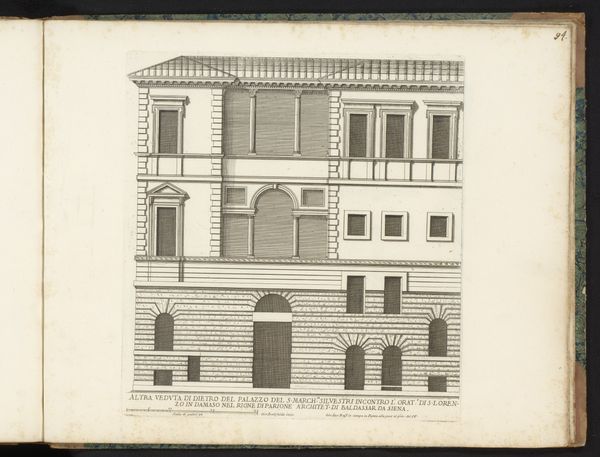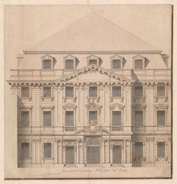 Curator: Here we have "Vertical Section of a Four-Story House with Greek Wall Ornament," a drawing and print from somewhere between 1800 and 1900, now residing here at the Met. It’s ink on paper and quite striking. Editor: Striking is one word for it. Austere comes to mind. It’s as if all the life has been vacuumed out, leaving only the facade. The geometry is so rigid. Curator: Well, it's an architectural drawing, meant to be precise. Consider the labor involved in producing these intricate patterns by hand. Someone meticulously drafted each line, each window frame, revealing the prevailing building practices and aesthetic values of that era. The ornamentation evokes classicism and speaks to social aspirations. Editor: But does the medium serve the subject? The stark, flat rendering, emphasizes the symmetrical grid and rhythmic repetition. It gives it this feeling of infinite, inhuman scale—less a place for humans than an exercise in pure form. Curator: True, but this abstraction could be seen as a critical commentary on industrialization. As urban environments rapidly evolved, drawings like this may have served as a way to negotiate and reconcile the tension between craftsmanship and mechanization. Consider where the materials might have been sourced and who would have had access to live or work here. Editor: It also reminds me of stagecraft, everything is set design and illusion. Notice how the heavy lines and the monochromatic palette enhance the artificiality of it all, revealing it’s a carefully constructed image. Curator: Which brings us back to process—the materiality and method illuminate not only the artistic values of the period, but also shed light on its socio-economic landscape. The means of production really dictates everything we see here. Editor: And in its meticulous design, and very formal balance, this building manages to distill something universal and enduring about the pursuit of order and beauty. Curator: Right, the way labor and resources are channeled reflects so much more. Editor: And that clarity reveals layers to discover again and again.