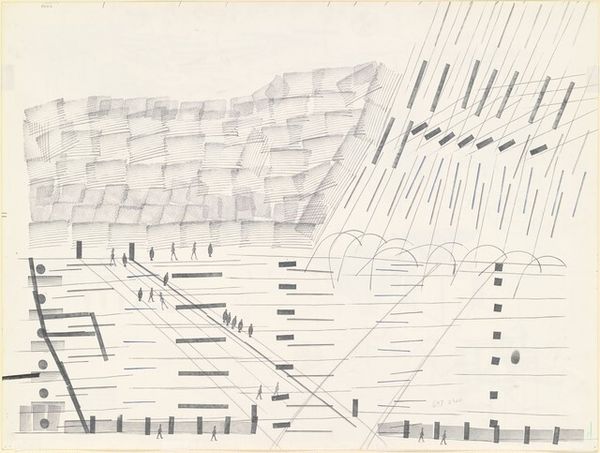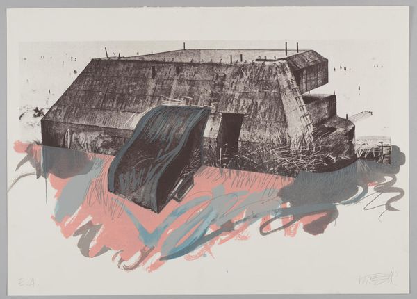 Rudolf Kügler created this print, "Marble Quarry," in 1958. Its visual power lies in the contrast between the rough, textured surfaces and the geometric shapes that structure the composition. The black horizontal band cuts across the scene, creating a visual tension between the upper and lower registers. Kügler masterfully uses etching techniques to create varied textures, suggesting the geological nature of the quarry. The cubes in the foreground appear solid yet are marked by lines that hint at the splitting and fracturing of stone. This interplay between form and texture can be interpreted through the lens of structuralism, where the underlying patterns reveal the inherent order and disorder of industrial processes. The composition invites us to consider the semiotic codes embedded within the image. The industrial structures symbolize human intervention and the transformation of the landscape. The print challenges fixed meanings, suggesting a dialogue between nature and industry. This print becomes a site for ongoing interpretation, reflecting our evolving relationship with the environment.