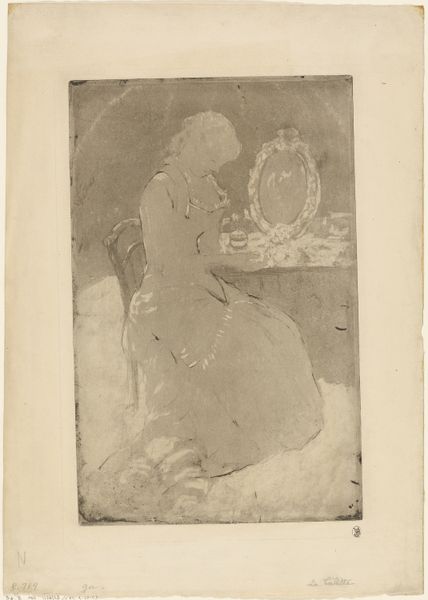 This etching by Louis Gallait depicts a young man with a violin in his lap and a broken bow on the floor. Gallait was a Belgian painter known for his historical scenes, and this work reflects the socio-economic struggles of 19th-century Europe. The figure's bare feet and simple garments speak to a life of poverty, a stark contrast to the artistry associated with violin playing. The broken bow becomes a powerful symbol of lost potential, a dream deferred. Is it a commentary on class and opportunity, or the lack thereof? The setting is dark and somber, the light only catching the boy's gaze and directing us to the broken bow. The young man’s downturned gaze evokes a feeling of helplessness. Through this simple composition, Gallait captures a moment of quiet despair, reminding us of the human cost often hidden within grand historical narratives.