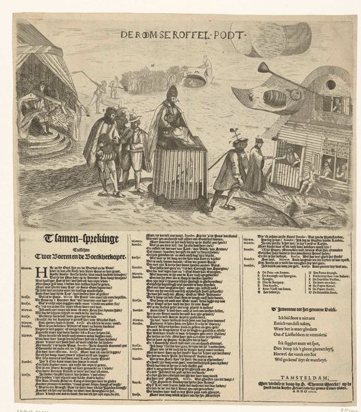 Curator: This is a fascinating piece, an allegorical print created anonymously in 1747. It's titled "Allegorie op de Franse aanval op de Republiek en de verheffing van Willem IV tot stadhouder, 1747," and you can see it here at the Rijksmuseum. Editor: It feels like stepping into a fever dream, honestly. There's a mermaid, a flying owl with a letter, a very regal-looking lion... it's chaotic and unsettling. The scale is interesting too, almost like looking into a miniature world filled with political symbolism I haven't decoded yet. Curator: Exactly. The artwork's composition and the deployment of so many iconographic symbols in such a compact space are the core of Baroque artistry. The piece essentially depicts the French attack on the Dutch Republic and the subsequent appointment of William IV as stadholder, hence all of the imagery. The lion you mention represents the Dutch Republic itself. Editor: Ah, the lion makes sense now. So the mermaid—or is that a siren, holding up what appears to be a theatrical mask—is she somehow representative of French deception perhaps? And is that gentleman to the right side symbolic of Dutch negotiation? Curator: Indeed. Many understand the mermaid as emblematic of maritime power—perhaps with the mask an ironic acknowledgement of disguise—whilst that other man, at least in my assessment, represents, perhaps, an Ottoman dignitary: the complex political calculus of the time involved delicate, yet important negotiations for naval agreements within the context of conflicts happening at that moment involving Europe's naval superpowers. The owl, one may deduce, bears diplomatic letters of sorts. Editor: Wow. To imagine such historical depth encoded into this small engraving is mind-blowing. The detail for an engraving feels pretty complex. What about the sword positioned up above by the central tree? The composition does feel loaded with so much storytelling on offer here... Curator: The sword? That might represent justice or even divine intervention. I sense there may also be additional symbolism in that small grouping around the centre; it has connections with this significant period within Dutch and global history... Editor: Looking at this today, it really makes me think about how even seemingly simple art can be a complex commentary on power, war, and political maneuvering, all in the artistic language specific to its era. Curator: It is more than commentary, I think; the work represents not only visual expression, but moreover, and quite crucially, documentation as well.