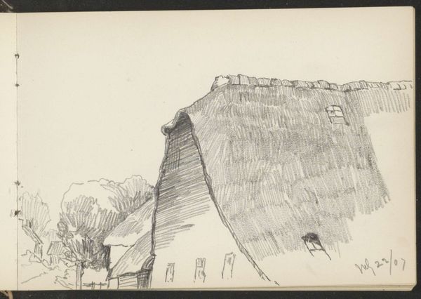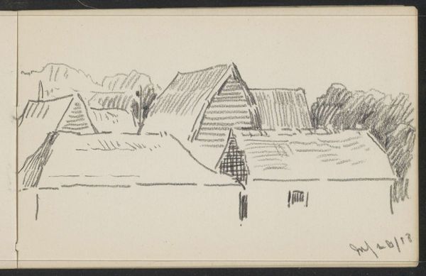 Curator: Here we have "Dorpshuizen" – that translates to Village Houses – a pen and ink sketch on paper by Alexander Shilling, dating from between 1913 and 1917. It's a glimpse into, well, a few humble dwellings. Editor: My first impression is of a scene hastily captured, yet so evocative of a quiet, unassuming existence. There is a palpable sense of stillness; a candid portrait of rural life. Curator: Look at how Shilling uses these simple lines, the very process speaks of efficiency. The buildings, constructed perhaps of rough-hewn timber and thatch, display vernacular craftsmanship born from local resources. These aren't architect-designed masterpieces but practical shelters, reflecting the everyday needs of their inhabitants. Editor: The image speaks of archetypes, though. Consider the steeply pitched roofs. Aren't they symbolic of shelter, a sanctuary? These homes are visual anchors, deeply ingrained in our collective unconscious. Note how the linear form creates a stage for the more substantial structures behind. Curator: It is interesting that the focus appears to be purely on the architecture. The sketch leaves out other details like signs of domestic activity or people that could have created a clearer vision of rural life. It seems almost diagrammatic. Editor: But in its simplicity, isn't there a powerful essence? Think of the psychological resonance of the archetypal "home." These aren't just houses; they are emblems of belonging, stability, the center of existence for countless lives. Shilling distills that idea with remarkable efficiency. It touches something primal, a longing for simple, unadorned refuge. Curator: I find the direct, almost pragmatic way that Shilling approaches this scene so engaging. There are houses rendered with locally sourced materials depicted here as humble dwellings. They aren’t necessarily quaint, nor luxurious. It depicts houses constructed by workers themselves with resources available from that area. Editor: Ultimately, I feel Shilling delivers not merely a picture, but an invitation. A doorway into contemplation, if you will. Curator: Indeed. An honest appraisal of labour and the shelter it provides, captured in minimal form.