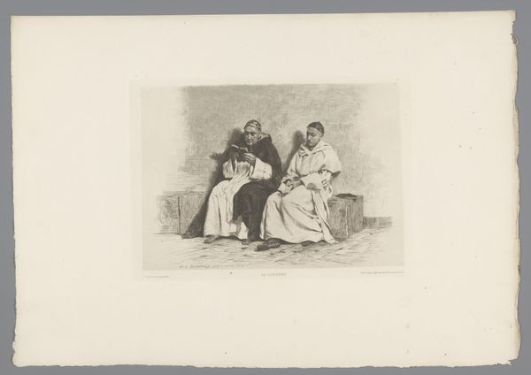 Curator: Looking at Félix Bonfils' photograph, "Bedouins Carrying Their Children", I'm immediately struck by the tender vulnerability in the children's posture. They seem so light, almost floating. Editor: It’s a posed image, definitely, but there's a lot to unpack in that staging. Bonfils was part of a wave of 19th-century photographers who shaped Western perceptions of the "Orient" through a colonial lens. Curator: You can feel the colonial gaze, can’t you? Yet, there's something about the gentle sepia tones and the way the light catches the fabric that almost softens it, makes it dreamlike. Editor: Softening is exactly the problem, isn't it? It romanticizes a lived reality, flattening cultural nuances into an exotic spectacle for European consumption. Even the title imposes an othering. Curator: I see your point. It's a dance between appreciation and critique, isn't it? We admire the technique, but we question the narrative it perpetuates. Editor: Precisely. It reminds us how crucial it is to critically examine the stories images tell, especially those crafted from positions of power. Curator: Absolutely. It's a complex image, beautiful and problematic. Editor: Indeed. A lens on history that we must view with our eyes wide open.