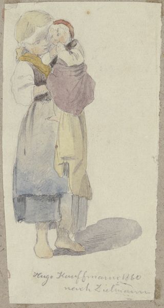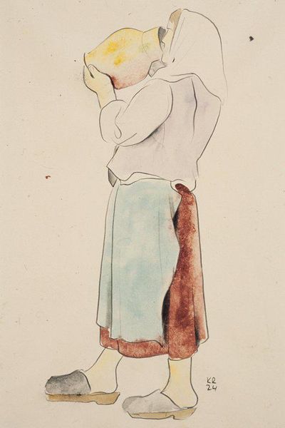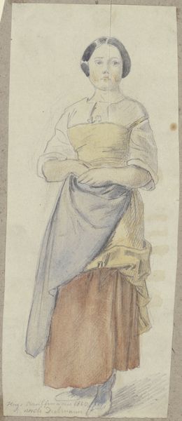 Johan Thomas Lundbye made this watercolor of an Italian woman leaning against a low stone pillar, sometime in the mid-19th century. The materials here – paper, pigment, water – are traditional, yet the artist's approach elevates the everyday. Lundbye’s technique emphasizes light and shadow, giving form to the woman's colorful striped headscarf and capturing the rough texture of the stone pillar. The way he layers the watercolor creates depth and volume, which is especially noticeable in the folds of her clothes. We can see Lundbye carefully rendered the weight and drape of the fabric, giving life to the scene. The beauty here lies not just in the subject, but in Lundbye’s skilled manipulation of humble materials. By focusing on the tactile qualities of everyday life, he prompts us to value the labor and culture embedded in the simplest of objects. This piece blurs the boundaries between fine art and the craft of living.