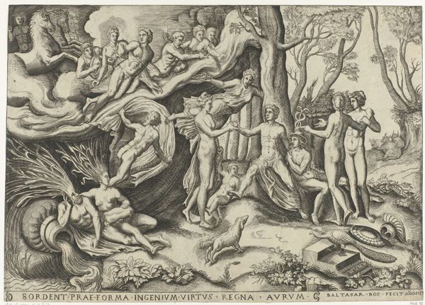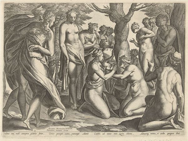 This print, titled "Diana Discovers Callisto's Pregnancy," was created by an anonymous artist using the intaglio process. This painstaking method involves incising an image into a metal plate, inking the grooves, and then pressing the plate onto paper. The visual effect depends entirely on the mark-making. Look closely, and you’ll notice the complex network of lines used to define form and shadow. The density and direction of these lines create tonal variation, which gives the figures depth and volume. The final print is a direct result of the labor-intensive process, requiring careful planning, skilled handwork, and a deep understanding of materials. Intaglio printing was revolutionary, because it allowed for the mass production of images, and the relatively inexpensive distribution of ideas and aesthetics. It was essential for circulating visual culture throughout Europe, connecting artists, and enabling the rise of a commercial art market. This print, with its narrative scene and classical references, exemplifies how even the most refined artistic traditions are deeply embedded in modes of production and broader cultural contexts.