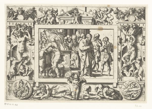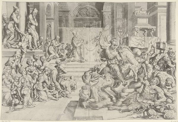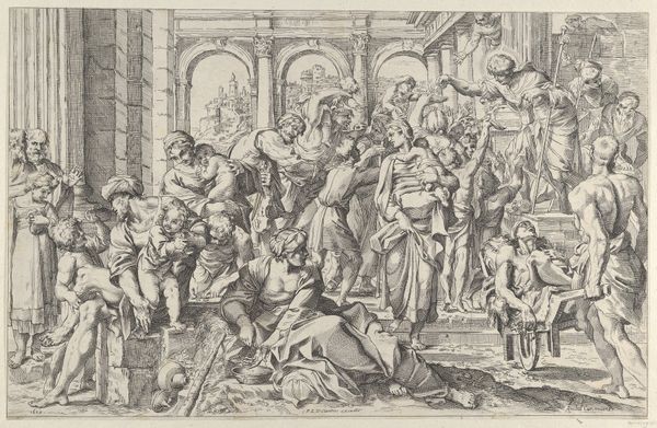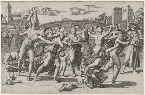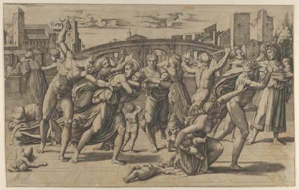 Giovanni Battista Cavalieri created this chilling engraving, "Massacre of the Innocents," in the late 16th century, a period marked by religious conflict and political intrigue in Europe. The image depicts King Herod's brutal decree to murder all male children in Bethlehem, a biblical event laden with themes of power, innocence, and resistance. Cavalieri renders the scene with a stark, almost theatrical intensity. Figures writhe in agony, their bodies contorted by violence and grief. Mothers desperately clutch their children, their faces etched with terror as soldiers carry out the horrific command. The stark contrast between the vulnerability of the infants and the brutality of the soldiers underscores the devastating impact of unchecked authority. This work reflects the anxieties of its time, where religious persecution and political upheaval were rampant. It serves as a potent reminder of the human cost of ideological conflict, resonating with anyone who has witnessed or experienced injustice.
