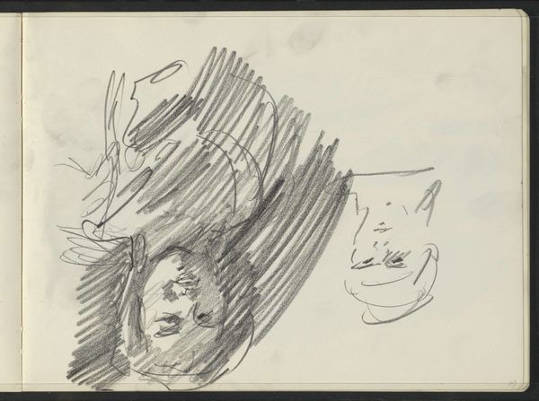 Curator: This drawing, whose creation is dated somewhere between 1916 and 1945, is titled “Hoofden van een Afrikaanse man.” It resides here at the Rijksmuseum and appears to be made with pencil on paper. Editor: Wow, my first impression is…introspective. The eyes are closed, almost like he's turned inwards. It feels incredibly private, a glimpse into someone’s quiet moment. Curator: I think that is an important lens to adopt, and perhaps a perspective that was denied to those racialized during this time, because a work like this can easily be interpreted within a framework of colonialism. Whose gaze are we seeing? And what power dynamics are at play when a European artist sketches an African man? Editor: That’s a good point, and the roughness of the sketch also gives the impression that it may be preparatory studies or a private exploration, a moment of artistic processing of the gaze you mention. I do feel like the almost cartoonish features softens a lot of potential sharp, colonialist edges. What I see in the larger head is a search for something tender and even innocent. Curator: The rendering, with its rather unsure lines, seems less focused on capturing an external likeness, but seems like a reaching out towards some sort of inner state, and that uncertainty invites a wider conversation around representation. Given the context of the time, the portrayal, albeit in a rough sketch, avoids overtly stereotypical features. Yet the closed eyes could still be interpreted as a denial of agency. Editor: Exactly, it’s so ambiguous. I also get this odd feeling of incompleteness from it – the work feels less like a polished statement, and more like… a thought, a fleeting idea on paper. And I love that! Curator: Perhaps we, as viewers, can then reflect on that fleeting idea, interrogate our own biases and presumptions, and appreciate the complexities inherent in artistic representation across cultural boundaries. Editor: Absolutely, art doesn’t need to give us answers. I like how this raw little sketch asks the important questions in a simple, but complex way. It’s almost like catching someone in the middle of a thought.