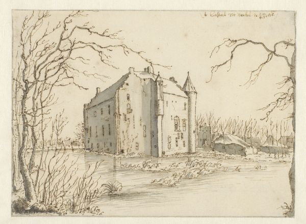 Curator: Roelant Roghman’s delicate pencil drawing, dating from around 1646-1647, presents us with a "View of Huis Bergestein, near Wijk bij Duurstede, Seen from the West." Editor: Well, hello, sleepy landscape. It feels… tranquil but also slightly melancholic. Is it just me, or does it look a bit rundown, that stately home? Curator: That perception might not be entirely inaccurate. Roghman was commissioned to create these drawings of castles and country houses at a time when many were falling into disrepair or being sold off, reflecting broader socio-economic shifts in the Dutch Republic. He's documenting a changing landscape, in a sense. Editor: Documenting, you say? So it's almost a kind of… visual elegy? For lost grandeur or shifting social structures. I like that reading much more than just, "nice building." The textures though! You can almost feel the rough stonework, the spindly winter trees... it really draws you in despite its faded appearance. Curator: The stark simplicity enhances that feeling, doesn't it? There are a number of people sketched by the walls of the castle and one walking down from its entrance. Through Roghman's choice to use delicate pencil lines to represent their scale in comparison to the house we can consider that, at the time, land ownership for the average citizen of the Dutch republic was unobtainable, and so they are depicted as tiny silhouettes against their surroundings. Roghman is offering us insight into land ownership inequality in 17th century Netherlands. Editor: See, I initially just thought "aw, tiny people". But thinking about land ownership in that context... yeah, gives it a whole other layer. Makes the dilapidation of the building feel less accidental, more symbolic. A bit haunting really. Curator: It speaks to the power of art to encode these subtle critiques and observations. Editor: It also reminds us that, even seemingly simple landscapes, they can carry echoes of complex social and political histories within their pencil strokes. Curator: Exactly. The drawing compels us to not only to gaze at what is pictured but also investigate the unseen circumstances and conditions surrounding it and for those depicted within it.