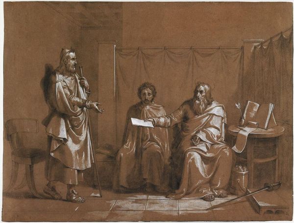 "Know Thy Self" by Benjamin West, now at the Brooklyn Museum, uses sepia ink and graphite to create an atmosphere steeped in classical antiquity. The composition, a semi-circular gathering of figures within a columned space, immediately evokes a sense of philosophical discourse. West masterfully uses light and shadow to guide our eyes, from the enlightened faces of the sages to the stoic bust in the background. The linear architecture, rendered with precise strokes, frames the organic arrangement of figures, creating a visual dialogue between order and dynamism. This interplay isn't merely aesthetic; it's a semiotic device. The balanced asymmetry hints at the complexities of self-knowledge, a theme central to classical philosophy. By positioning the figures in various states of contemplation, West seems to suggest that understanding oneself is an active, multifaceted process. The sepia tones further serve to distance us, reinforcing the timeless relevance of introspection. Consider how West uses line and form to explore the tension between individual thought and collective wisdom. The drawing thus becomes a powerful meditation on the pursuit of truth, inviting us to reflect on our own quests for self-understanding.