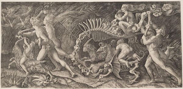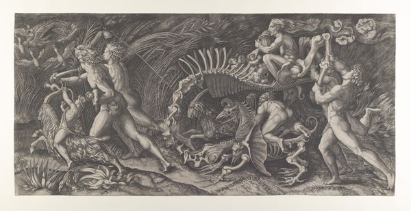 Editor: So, this is Domenico Beccafumi’s "The Sea Gods," made with etching and engraving. It feels like a fever dream! All these fantastical creatures and the almost obsessive detail in the linework. What can you tell me about this piece? Curator: This print certainly presents an opportunity to explore the materiality of art production during the Mannerist period. Look closely at the dense cross-hatching, the way Beccafumi layered the etching and engraving. Think about the labor involved, the repetitive, almost meditative process of creating such intricate detail using metal plates. Does this attention to material detail change your initial interpretation of its "fever dream" quality? Editor: Well, knowing it's a print and thinking about the process definitely grounds it a bit more. It's less about pure fantasy and more about the skill and technique required. It makes me wonder who this print was made for? Was it for mass consumption, or a more elite audience? Curator: Exactly. The question of audience is key. The production of prints like these served multiple functions. Yes, it allowed for the dissemination of imagery to a wider audience, creating a market for art beyond unique paintings or sculptures accessible only to the wealthy. But consider, too, the skilled labor that would have been needed and who controlled that labor. Are the themes entirely 'elite' or were there middle-class buyers for prints such as this? Editor: That's a great point. So, the material aspect isn't just about the artistic process, but the whole economic and social context of its making. Thinking about the commerce of prints is new to me! Curator: Precisely! And by examining the materials and process, we move beyond just aesthetic appreciation and get closer to understanding the artwork’s place in its time. The "Sea Gods" becomes a document reflecting the technologies, economies, and social structures of the era. Editor: This completely changed how I'm seeing it now! Thanks for walking me through it.