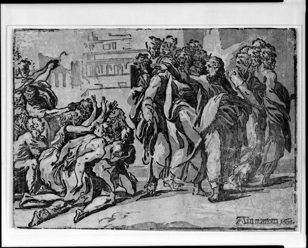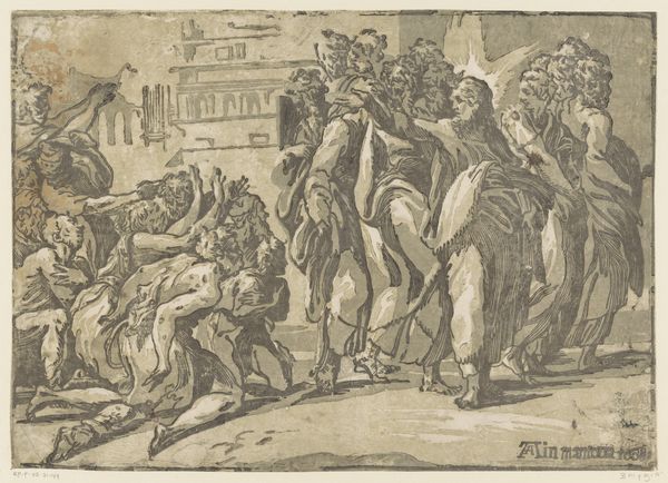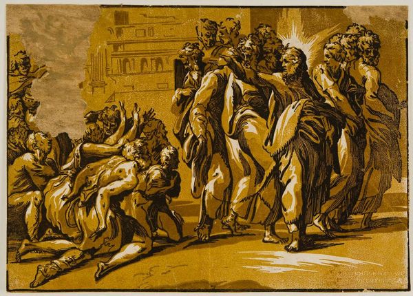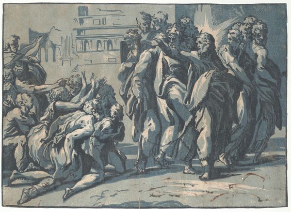 Editor: Here we have Giuseppe Niccolò Vicentino's "Christ Healing the Sick," housed in the Harvard Art Museums. It’s a powerful image, and the figures seem to spill out of the frame. What strikes you about its composition? Curator: The dynamism certainly captures the eye. Note how Vicentino uses chiaroscuro to direct our gaze. The contrast between light and shadow isn't just descriptive; it articulates the emotional weight of the scene. Editor: So, the light isn’t just about illumination? Curator: Precisely. It's a structured element, enhancing the drama and guiding the viewer through the composition. The artist uses light as a compositional tool, and a symbolic one. Did you notice how the architecture in the background is rendered with geometric precision? Editor: Yes, the juxtaposition of the chaotic crowd and the ordered architecture is interesting. Thanks, I hadn't thought about that!