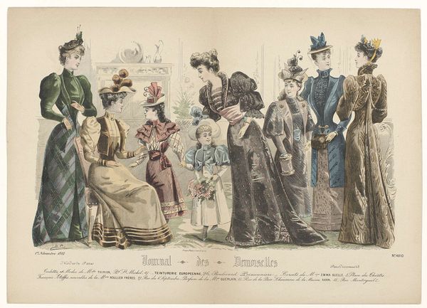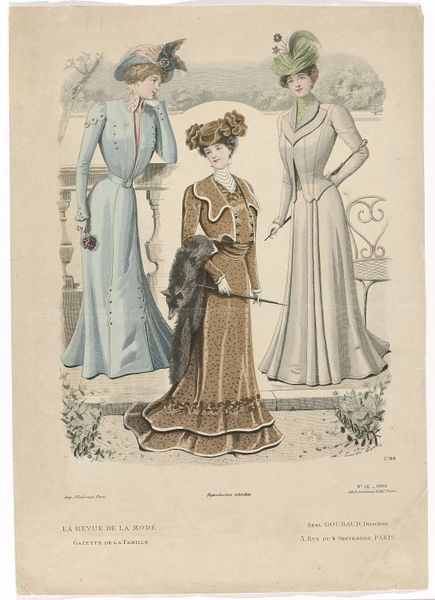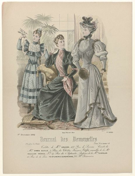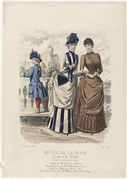 This fashion plate was published in Paris in 1887, offering a snapshot of late-19th-century style. It’s made through printmaking, a process that allows for mass production and wide distribution. The material of the print itself, paper, is relatively inexpensive, in contrast to the luxurious textiles and elaborate embellishments depicted. Think of all the labor involved in creating these garments: the spinning of thread, weaving of fabric, cutting, sewing, embroidery, and trimming. Each dress represents countless hours of work. The print acts as a promotional tool, fueling consumer desire and demand for fashionable goods. It highlights the relationship between art, commerce, and the burgeoning fashion industry, which employed countless workers at all levels of society. By focusing on the material and processes represented here, we realize that this image is not just a pretty picture, but a window into the economic and social realities of its time.