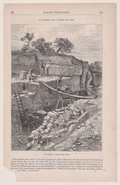 Curator: "Le Verveux; from Magasin Pittoresque" is the work, an engraving by Charles Jacque, created sometime between 1848 and 1864. Editor: The scene has a tranquil, almost melancholy air. The dark, dense foliage is so closely intertwined it appears impenetrable, framing a seemingly still body of water. The mood strikes me as somewhat melancholic, almost brooding. Curator: It's a Romantic depiction tinged with Realism, reflective of Jacque's broader artistic approach. The image portrays a fishing scene, with two figures in a small boat on a river or stream. It originally appeared in "Magasin Pittoresque", which sought to popularize knowledge and culture through accessible imagery. Editor: Right, the ‘picturesque’ aspect— the workers in the boat seem like a part of the idyllic natural environment but are engaging with nature’s exploitation at the same time. The detail in the trees is striking, and even the way the figures are rendered gives them this weightiness, as if to highlight humans are part of the scenery. Curator: Absolutely. It's important to remember the social context. Genre paintings like this were popular among the rising middle class. They depicted scenes of everyday life, offering a glimpse into rural existence. But they also played a role in constructing idealized versions of the French countryside, subtly reinforcing ideas about national identity. Editor: And by focusing on labor, images like this obscure its exploitative dimensions by centering labor within pleasant, accessible aesthetics. The figures become archetypes stripped of social identities, which further pushes an abstract sense of harmony onto a lived reality defined by deep inequality. Curator: Exactly, Jacque and others took great inspiration from the Dutch Golden Age masters who explored similar themes. He clearly wants us to appreciate the workers but, at the same time, there's no critique or analysis of those power structures in play. Instead, the labor is subsumed by an admiration for the "picturesque," to your point. Editor: Considering Jacque’s association with the Barbizon school—he lived in Barbizon starting around 1849-- it might also speak to the group's political position towards agrarian societies, in alignment with peasant populations increasingly coming into modernity. Curator: That said, I would have liked to see some more nuanced social and historical contexts included here at the Met around this fascinating piece. Editor: Perhaps more information, but it's a stunning piece that provokes deep thought about human interaction with the natural world.
