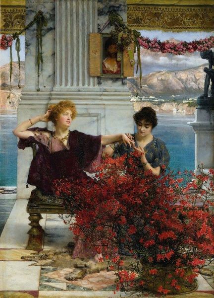 Lawrence Alma-Tadema painted "Loves Votaries," at a time of rising industrialization and social change in Britain. He transports us to an idealized vision of ancient Rome, a world of leisure and beauty. Here, two women recline in what looks like a marble terrace overlooking the sea. The term “votaries” means devotees or followers, and there is the sense they are immersed in their own world. Note the way the soft lighting and delicate brushwork enhance the sensuality of the scene, with its marble textures and the floral details in the women’s hair. Alma-Tadema often drew on historical sources for his paintings, yet he infused them with his own aesthetic sensibilities. What do you think about how the painting invites us to contemplate the nature of beauty, pleasure, and female companionship? The women are outside of societal expectations and they can find respite from the constraints of Victorian society. "Loves Votaries" speaks to the human desire for connection, pleasure, and escape from the everyday.