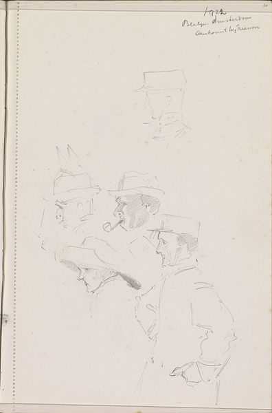James McNeill Whistler sketched "Group of four men" using graphite on paper, showing men gathered perhaps in a pub. Whistler lived as an expatriate in London and Paris, and in both places there was an emerging sense of the modern, the city, the casual, and especially, the masculine. Whistler, like many artists of his time, was interested in capturing everyday life. The sketch invites us into this masculine space of camaraderie and leisure, but its fleeting quality also acknowledges the tentative nature of such social bonds. The use of quick, light lines conveys a sense of movement and informality. The men, dressed in what appear to be casual hats and coats, suggest a departure from more formal, traditional portraiture. This drawing offers a glimpse into the shifting social dynamics of the 19th century, where new forms of male bonding and leisure were emerging, captured here with a delicate, almost ephemeral touch.