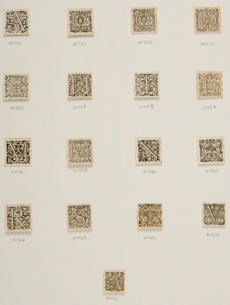 Curator: At first glance, this array of letterforms almost feels like a sampler or a reference sheet, doesn't it? Editor: It does, a rather austere one, considering the ornamentation. Each letter is so meticulously rendered, encased in its own little garden of stylized foliage. Curator: Indeed. It is entitled "Letter A," and it comes to us from an anonymous hand. Each letter is contained within a square frame, though the material and the date of execution remain elusive. Editor: The floral motifs feel…familiar, like echoes of illuminated manuscripts or early printed books, tapping into that cultural memory of the hand-made rendered in the age of mechanical reproduction. Curator: Precisely! And it's hard not to see them as emblems, almost heraldic, each letter a tiny self-contained world representing something larger than itself. Editor: I agree. They are visual anchors, preserving a tradition while simultaneously suggesting the inevitable fragmentation of language itself. What a delicate balance. Curator: It’s fascinating how these seemingly simple symbols hold so much historical and cultural weight, isn’t it? Editor: It is a quiet testament to the enduring power of symbols in shaping our perception and preserving collective memory.