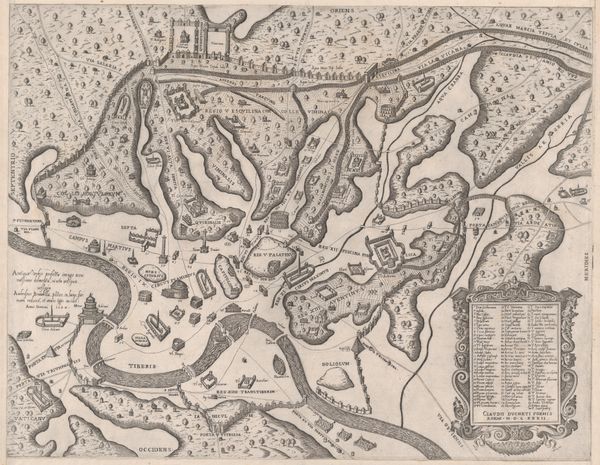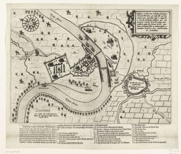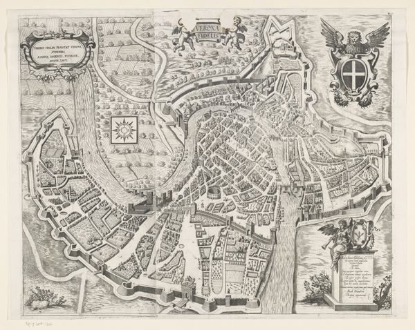 Curator: This engraving, created by Baptista van Doetechum in 1602, depicts the siege of Grave. Editor: My first impression is one of incredible detail. The landscape seems to stretch endlessly, meticulously mapped, and rendered. It really highlights the labor that went into its creation. Curator: Absolutely, the level of precision is remarkable. Maps like these weren't just geographic tools. They served as potent symbols of power, knowledge, and control. See how the besieging forces are represented? They’re almost a kind of ordered swarm. Editor: And the city itself is almost stylized, an object. It emphasizes control, perhaps? Control of the resources within its walls, and in the adjacent farmland? I imagine a lot of labor went into erecting these fortifications. I wonder about their functionality versus their symbolic weight? Curator: Yes, and think of the cultural impact of this imagery, spreading information, shaping perception, not just about the event itself but about Dutch identity. Note the banners, symbols of allegiance, all serving to emphasize not just who controls Grave, but who is invested in the place. Editor: I am also noticing the border with those armorial devices. They underscore, too, the social and economic relationships which facilitated both its making, its distribution, and it ultimate use. This print had a function, not merely artistic or aesthetic, but documentary. What social groups would have had access to something like this? Curator: Likely elites, the military class, and those invested in trade. These images were currency in a way, solidifying relationships through shared understanding, perhaps reinforcing allegiances or warning others of the rising influence of Dutch power. Editor: It all loops back to process for me, right? How this print circulates as a physical object tells us about social connections and trade networks. Curator: For me, too, in some sense. How symbols become associated with movements of power is fascinating here. I think in particular the depiction of armies. Editor: Examining this work gives me a renewed respect for the processes that mediate visual information and their economic contexts, the power relations they underscore, and the many laborers behind the final product. Curator: For me, looking at the symbolic register of the work invites me to contemplate the power of mapping itself. Representations create as much as they depict.