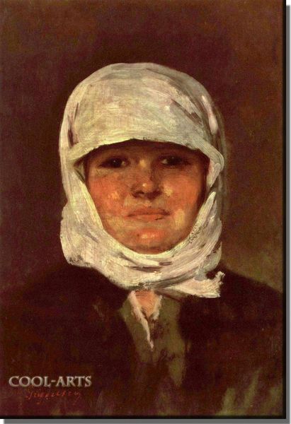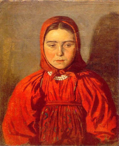 Curator: Immediately, the girl's steady gaze meets ours; her expression is strikingly direct, even vulnerable. Editor: This is "Girl in a Kerchief (Portrait of the Girl)," an oil painting by Konstantin Egorovich Makovsky, dating back to 1870. Let’s consider it through a historical lens: portraits like these became powerful markers of identity and status within the burgeoning middle class in Russia during that period. Curator: That direct gaze speaks to more than just status; there's an invitation to engage. The kerchief itself is a powerful symbol here. Beyond mere adornment, it conceals and reveals simultaneously, adding to the sense of intimacy but also distance, hinting at secrets. The flower pattern connects her to ideas of womanhood in both art and folklore. Editor: Indeed, and consider how Makovsky renders those floral details against the somber backdrop. His embrace of both realism and romanticism is clear in how he balances accuracy in capturing her features with an idealized presentation. The rise of realist portraiture went hand in hand with discussions around peasant life in 19th century Russia. This brings forth larger questions, such as: who gets portrayed? What do their clothes symbolize? Curator: This painting becomes a rich intersection between personal expression and cultural expectation. She might embody many things; maidenhood, motherhood, or merely, the idealized Russian woman. Editor: It underscores that her very image—especially circulated through exhibitions—played a key role in shaping public perceptions and promoting certain values. As such, it became enmeshed with larger social, cultural, and political forces during an era when art began performing crucial public functions. Curator: Makovsky has successfully turned a simple portrait into a tapestry of visual cues about femininity, society, and the very soul of Russia itself, giving us a potent glimpse into a bygone era. Editor: Looking at it now, knowing how art intertwined with the cultural politics of the era, makes it impossible to see her image as neutral, doesn't it?