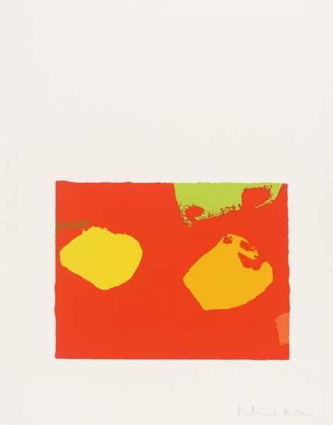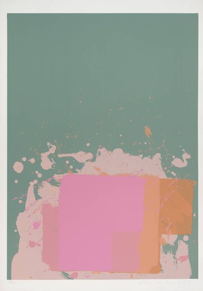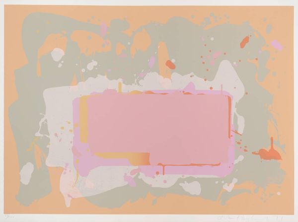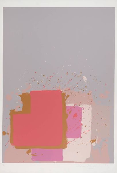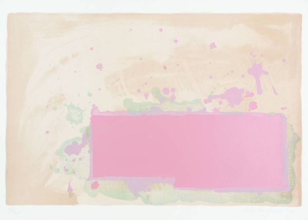 Curator: Standing before us is John Hoyland's "Red Black on Pink," a compelling work from 1971 rendered in acrylic and ink. Editor: My immediate response is that it’s… unexpectedly gentle. For something titled “Red Black on Pink”, there's an incredible softness to the composition, especially given the scale, I believe it's quite large. Curator: Indeed, Hoyland's pieces are usually large and demand attention. The choice of colors here is key. This particular composition occurred during an era where artistic license blossomed in tandem with second wave feminism. Editor: Precisely, looking closely, the pink serves as the overarching atmosphere. However, there’s more than one pink interacting on the surface—a pale rosy backdrop overlaid with sharper hues of rose and hints of mauve near that intriguing red-bordered geometric form. It’s subtle yet sophisticated. Curator: The "red black" element, in reality a kind of muted maroon-brown that frames one side of the prominent form. Think of the second wave's project—to challenge traditional structures with fresh ideas. This resonates through the work’s disruption of visual expectation. Editor: Yes, Hoyland cleverly teases with shapes. Note that nebulous splattering near the upper part of the artwork! Curator: I read it as breaking from social molds and norms. Hoyland perhaps captured those feelings of both cautious optimism and unbridled expression synonymous with the dawn of new waves of cultural shifts. Editor: The surface, however, resists a singular interpretation. I can see the gesture; the action. Curator: This piece certainly invites contemplation on identity, gender roles and evolving modes of aesthetic awareness, specifically through its striking color juxtapositions. Editor: Looking one final time at the canvas as a whole, one has to marvel at how well the geometry communicates with chaos through the application of different shades of pink acrylic and the almost hidden application of the ink blots. Curator: Yes, seeing it now, understanding the complex negotiations within the women's liberation and human rights movements that it reflected in art. What a statement indeed!