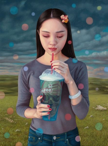 Curator: Looking at this work, "Best Friends" by Alex Gross, I am immediately struck by its blend of realism and the surreal. What are your first thoughts? Editor: It's unsettling, in a good way! Like a snapshot from a slightly off-kilter reality. The colours are so vibrant, yet there’s this weird emptiness, especially with the blurred face. It gives me that uncanny valley feeling, you know? Curator: Absolutely. Considering Gross's body of work, this fits into his style, juxtaposing the everyday with hyperrealism. The use of acrylic paint, typically seen as accessible, allows him to create almost hyper-smooth surfaces. Look at how that 7-Eleven sign looms, nearly as important as the figures. Editor: True. I can't help but imagine these friends have met in front of 7-Eleven. There's something about how mundane this scene is that magnifies its emotional punch. Like, their connection feels intimate but also distant, almost mediated. And the polka dots... they float between us and them. Curator: That’s interesting because you see how this work could speak about consumption culture and also anonymity. It looks so contemporary because that brand logo is part of our landscape. By rendering the friend's face pixelated, is the artist suggesting alienation in our networked society, or protection of their identity? The layering of references is clever, inviting closer inspection. Editor: Perhaps it suggests we're all walking around like blurred copies of ourselves, consuming identical snacks with pixelated expectations? I’m half-kidding! The longer I look at it, though, the more this ordinary street corner pulses with strange energy. And who doesn't have a deep memory or connection to a specific 7-Eleven? They seem to become landmarks. Curator: Right, a commonplace site rendered surreal! The use of "common" things, from the figures' ordinary clothes, to the setting and use of acrylics brings high art and everyday life together. A great reflection of a new sort of shared culture. Editor: In all its strange and accessible ways. I think there's so much to unpack with such everyday yet haunting paintings.
