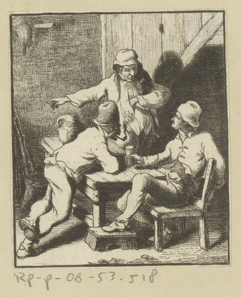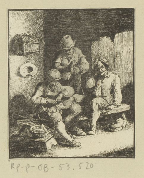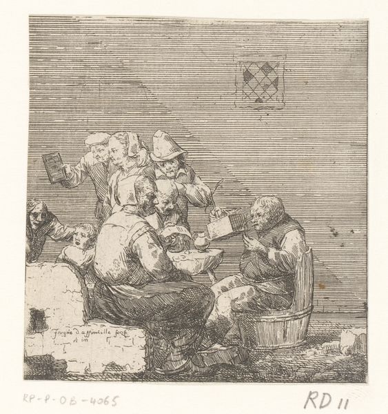 Jacques Dassonville’s etching captures seven peasants in a rustic setting, the central figure lighting a pipe. The pipe, seemingly simple, carries a rich history, often linked to leisure, camaraderie, and contemplation. Consider how the motif of smoking appears in Dutch Golden Age paintings—sometimes as a symbol of earthly pleasures and other times as a memento mori, a reminder of life's fleeting nature. This duality echoes in earlier depictions of similar objects in medieval vanitas paintings, where it symbolized the transience of sensory experiences. These symbols are not static; they evolve. What began as a signifier of worldly indulgence shifts to a tool for social bonding. The pipe, therefore, becomes a vessel of shared experiences and collective memory, subtly engaging our subconscious with themes of mortality and pleasure. It serves as a looking glass, reflecting our own complex relationship with time and enjoyment.
