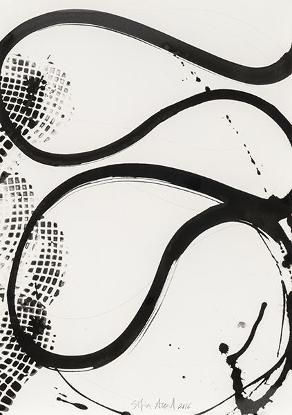 Full Life is a large relief consisting of a painting combined with metal sculptural elements, which depicts a number of objects – a fork, a set of three keys, a safety pin and a handgun – at much larger than life size. These are represented using white lines against a uniform blue background, as well as thin, black metal rods that extend beyond the edges of the support, so that when the work is displayed the metal parts are set against the wall of the exhibition space. Although they are depicted as if three-dimensional, the way in which the items are superimposed over one another and presented without any accompanying environmental cues makes it difficult to ascertain clear spatial relationships between them. Furthermore, they appear out of proportion with one another: the safety pin, for instance, is as large as the pistol. The objects are all depicted in the same highly stylised manner, which is reminiscent of diagrammatic drawings or commercial illustrations.